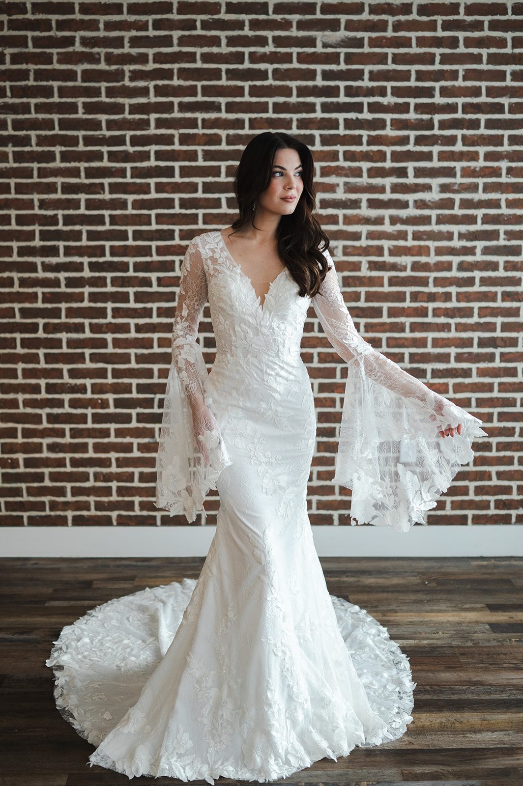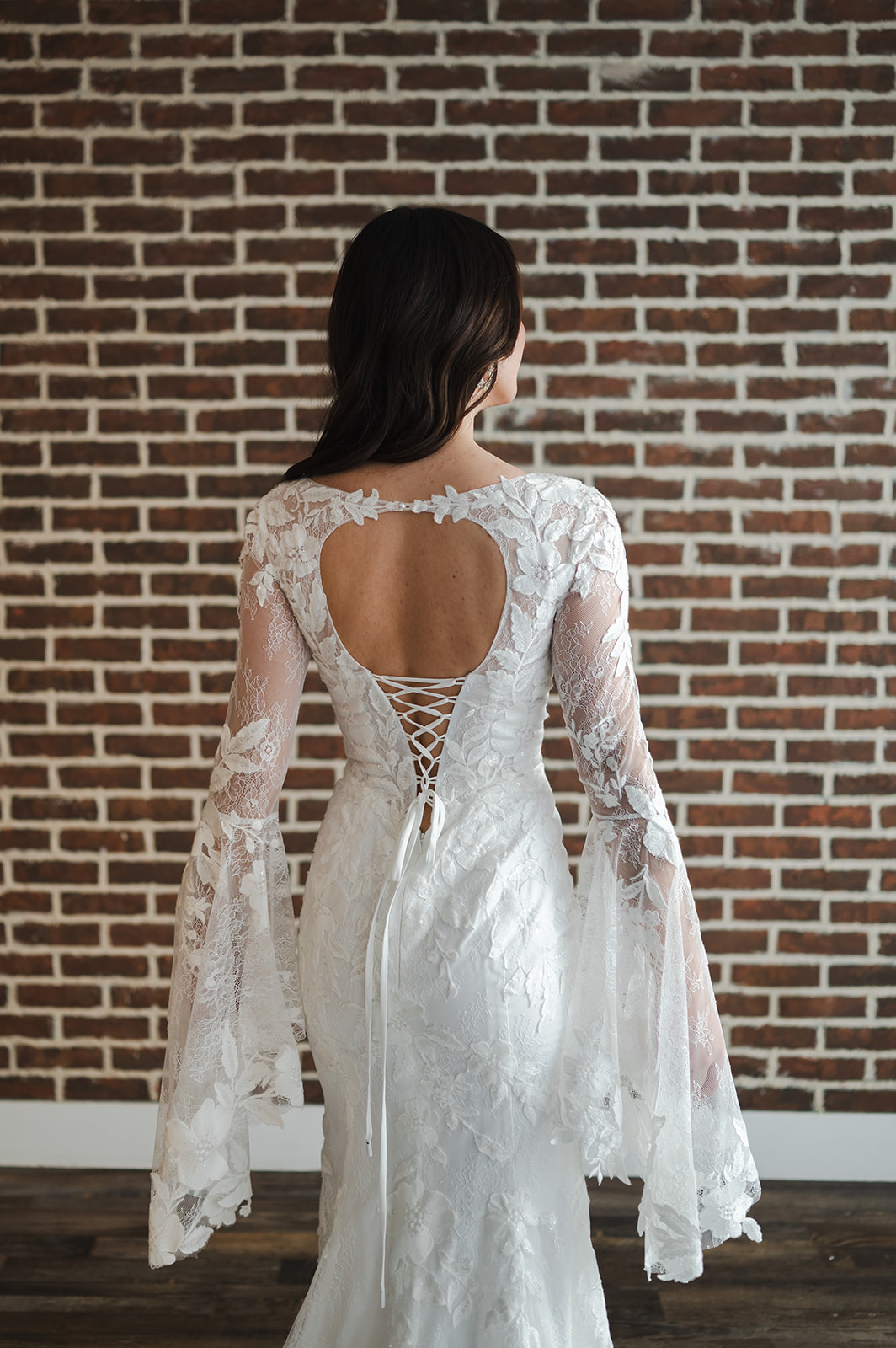 The Tish gown has no shortage of details to love! Double layered lace, an open back with lace up finish, and those beautiful bell sleeves.