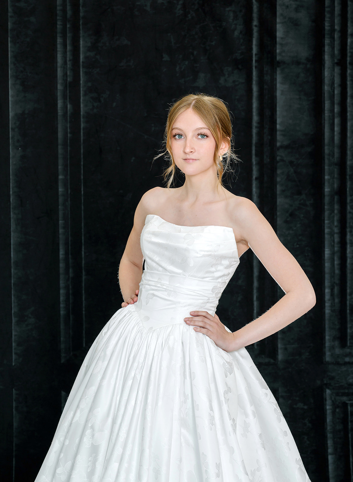 The Azalea gown is a stunning Basque waist ballgown in a jacquard with a rouched bodice and scoop neckline.