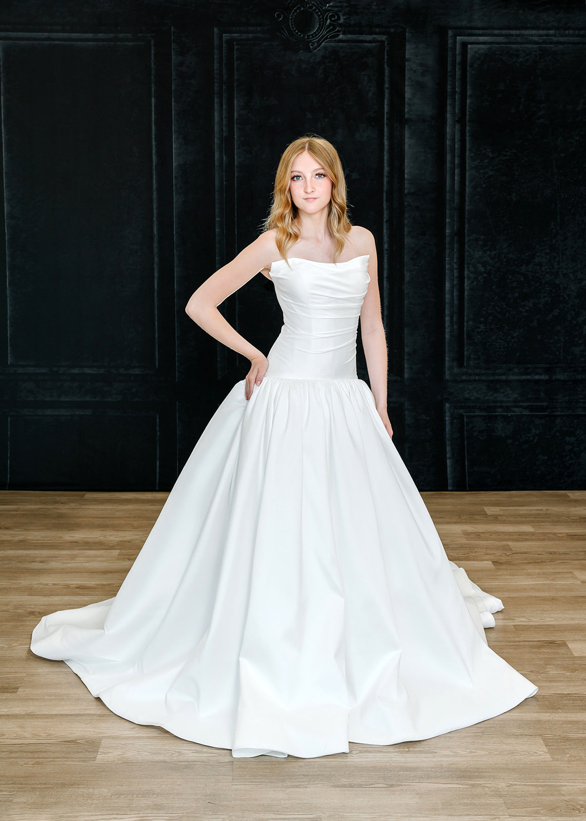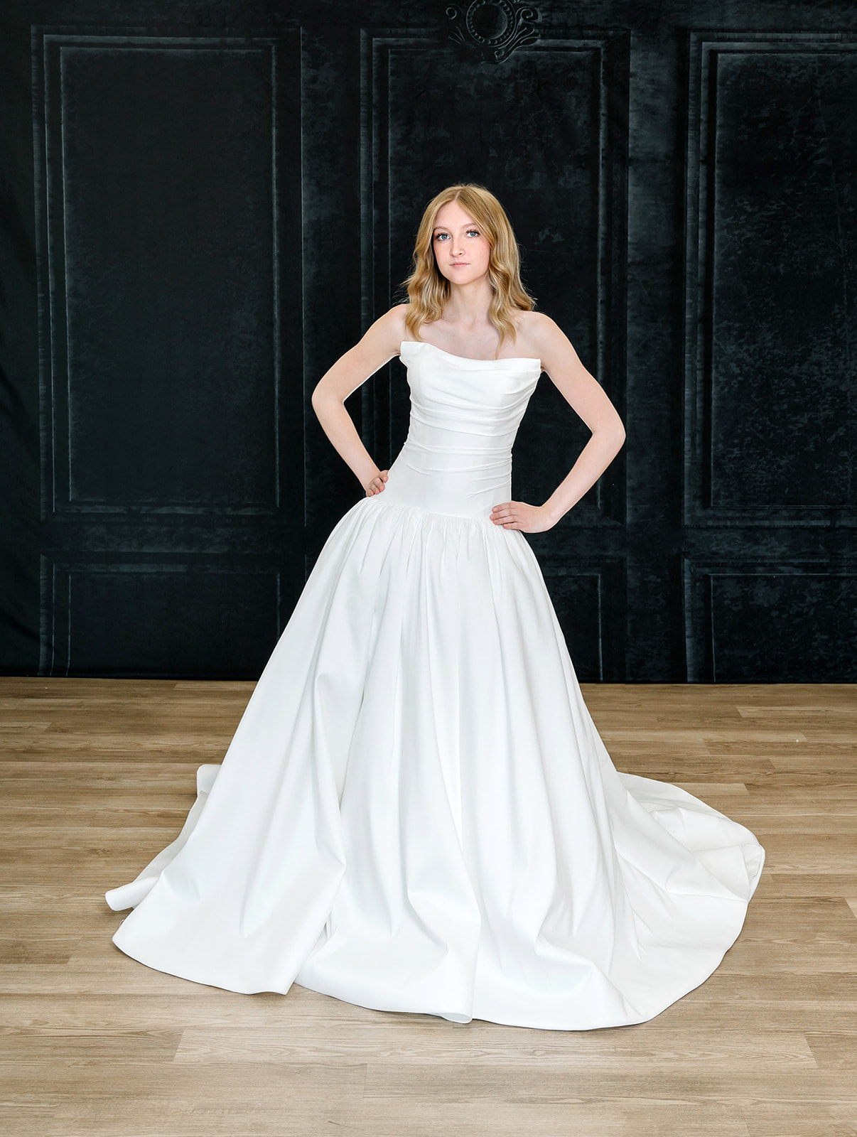 The Kate gown is a satin drop waist ballgown with a rouched bodice.