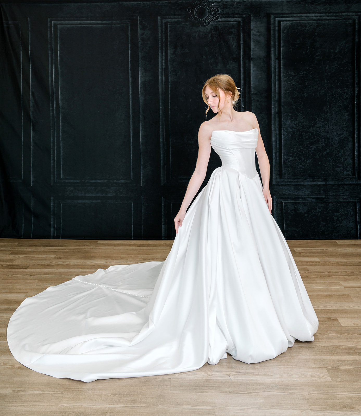 The Sofia gown is a Basque waist ballgown with a corset seamed bodice with a draped cowl scoop neck.