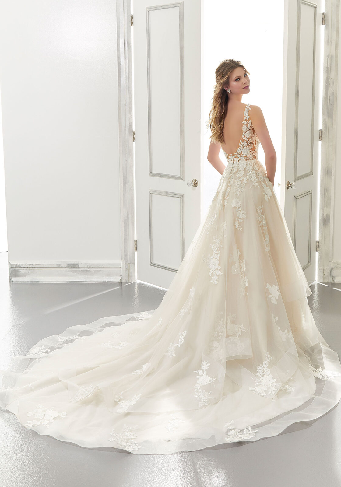 Traditional with a touch of trend, our Audrey wedding dress features a sheer V-neck bodice accented in chalk white and crystal beading. Frosted, embroidered appliqués add depth and dimension to the full, Tulle ball gown skirt. A flounced overlay skirt trimmed in horsehair edging completes the look.