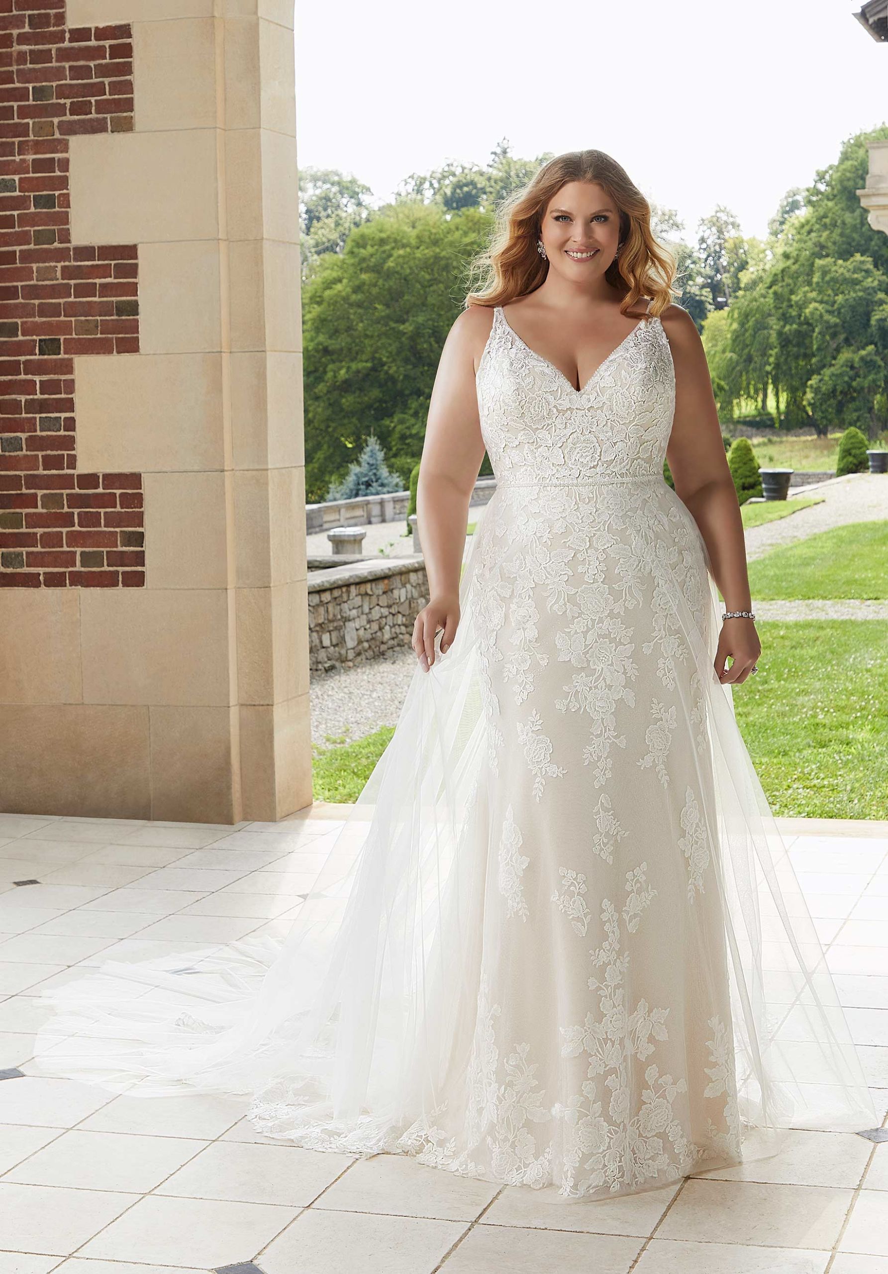 Esme is a stunning sheath wedding dress with a blingy crystal beaded v-neckline and scoop back on a relaxed sheath silhouette. The sparkle net fabric shimmers from all angles, while the frosted, floral embroidered lace and sheer petal train keep the look soft and romantic. Add on the airy, detachable tulle overskirt for extra dama as you walk down the aisle.