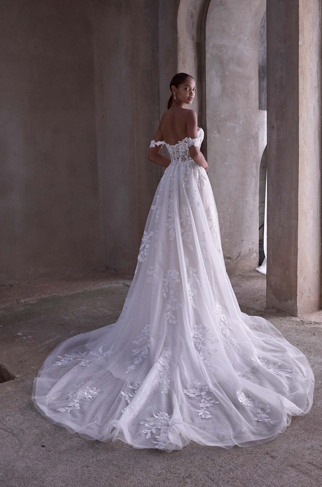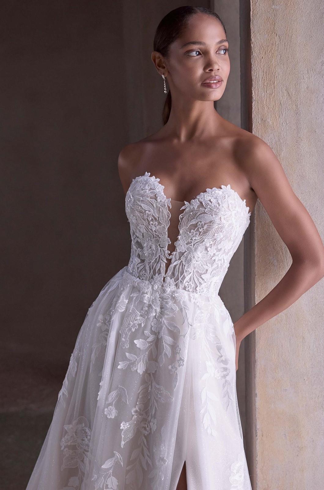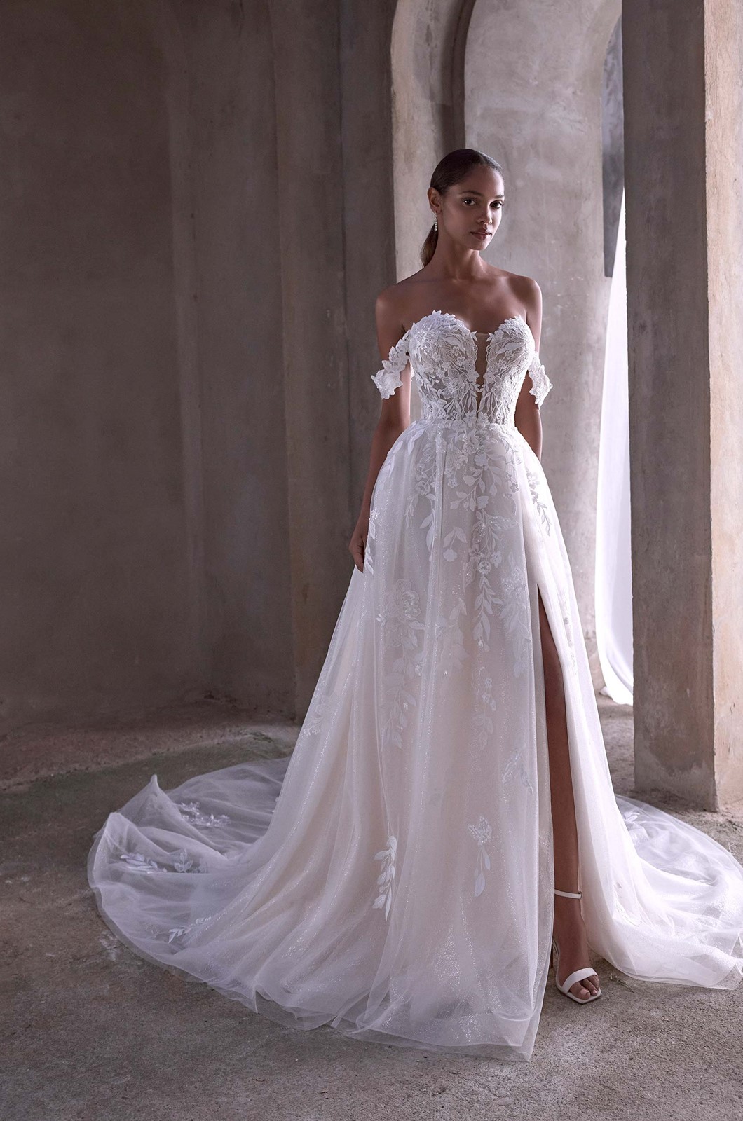 A bold expression of romance and light, our Filippa wedding dress features a sweetheart strapless bodice with a plunging center front and detachable off-the-shoulder straps for added drama. Intricate sequin and floral beaded threadwork appliqué dances across layers of glitter tulle, catching the light with every step. The A-line silhouette opens to a slit and sweeping train, effortlessly balancing modern allure with timeless bridal elegance.