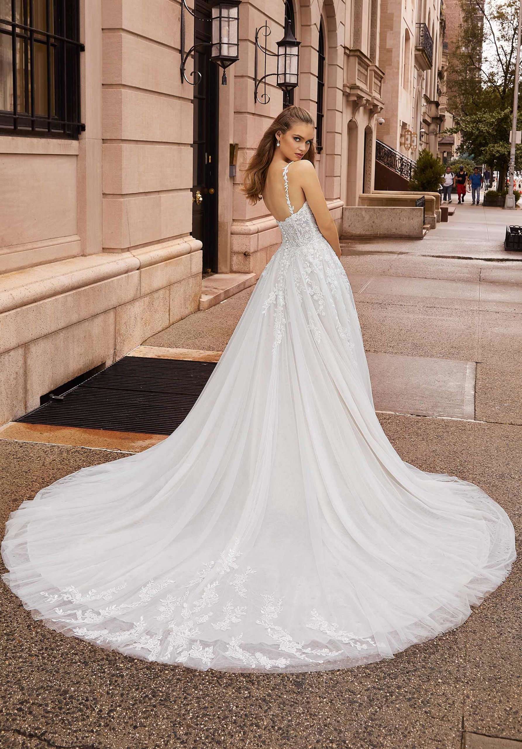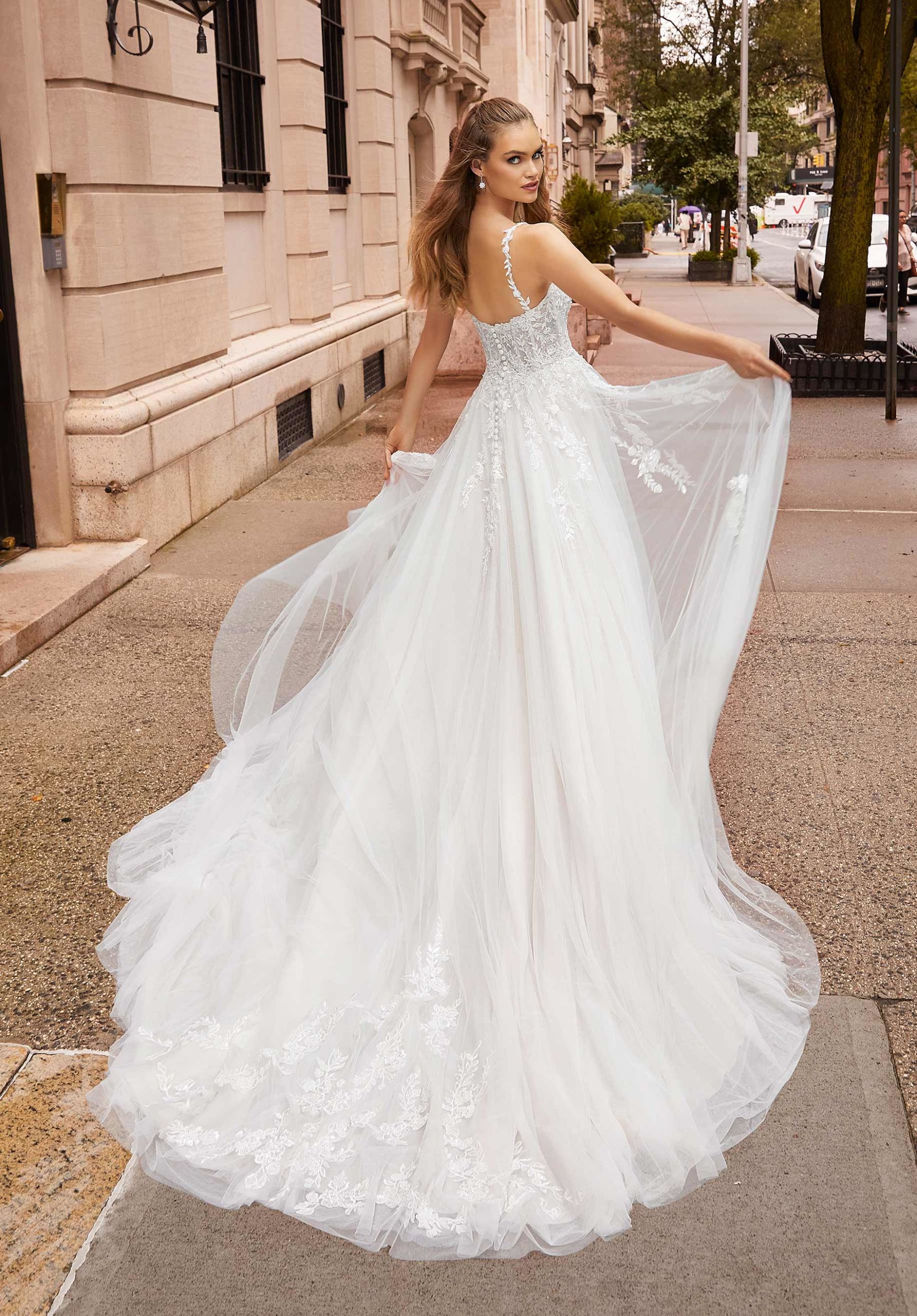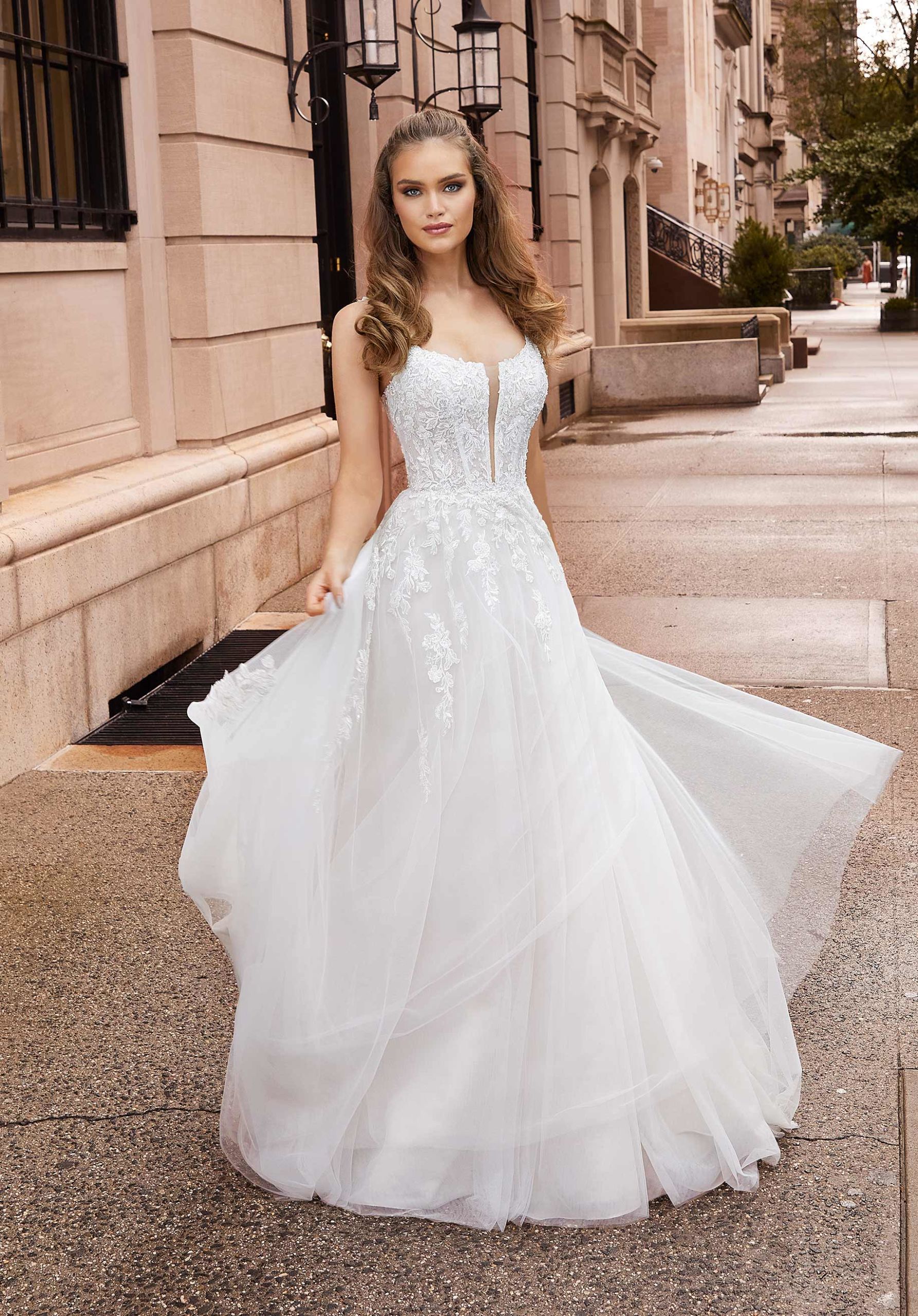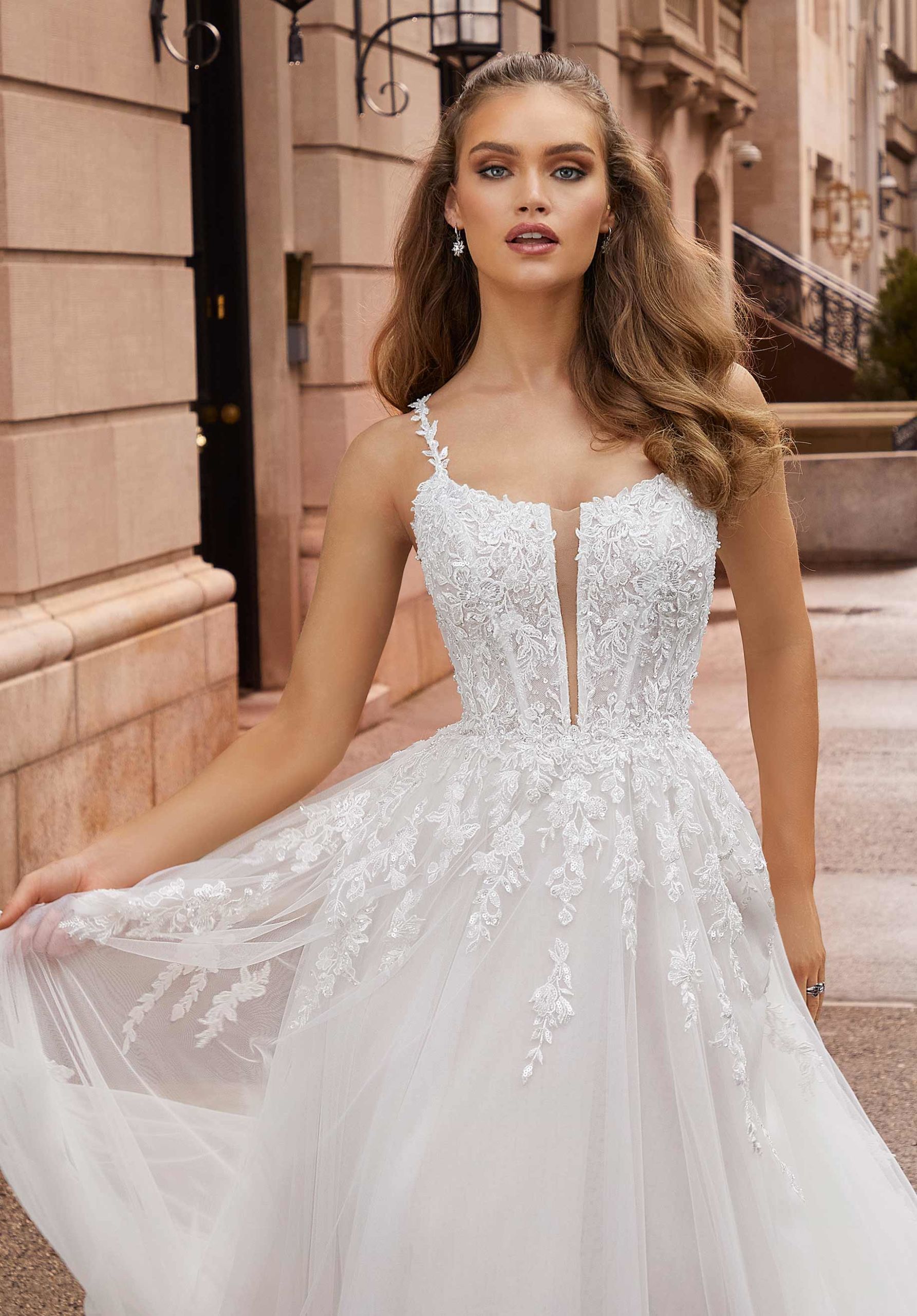 Delicate and dreamy our Johanna designer wedding dress offers effortless beauty. The elegant A-line floats off the body in a billowing tulle skirt paired with a romantic Chantilly lace bodice featuring stunning crystal beaded embroidery. The deep plunging detail on the soft scoop neckline offers a modern touch to the lovely dress.