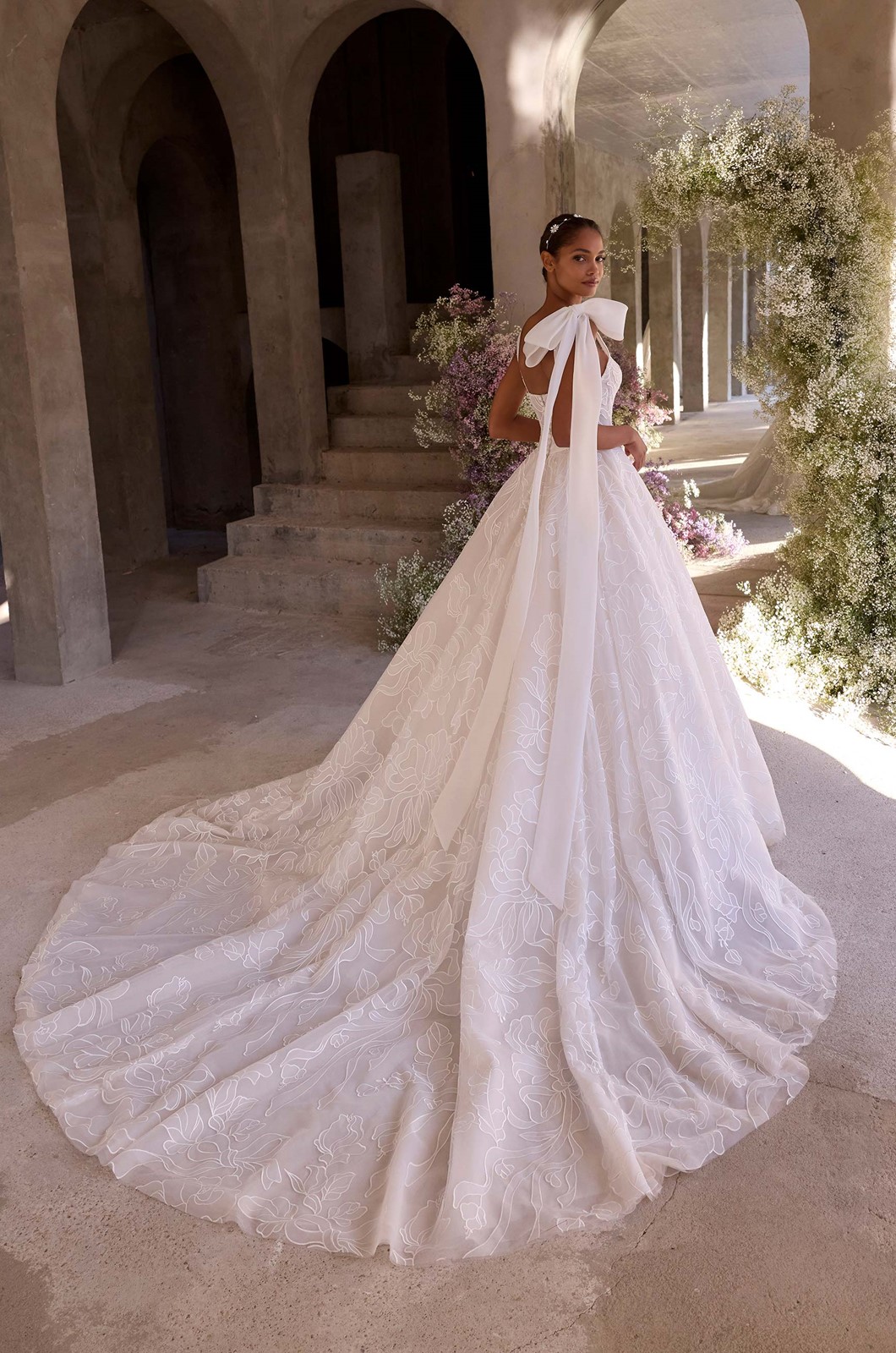 Sheer volume with graphic romance, our Leda wedding dress features a structured square neckline and corset boning to adding structure to the softness of the floral burnout organza. The full ball gown silhouette has a defined waist and flows into a sweeping train. The detachable oversized bow is a playful touch and offers versatility in styling. Shown in Ivory/Champagne/Porcelain.