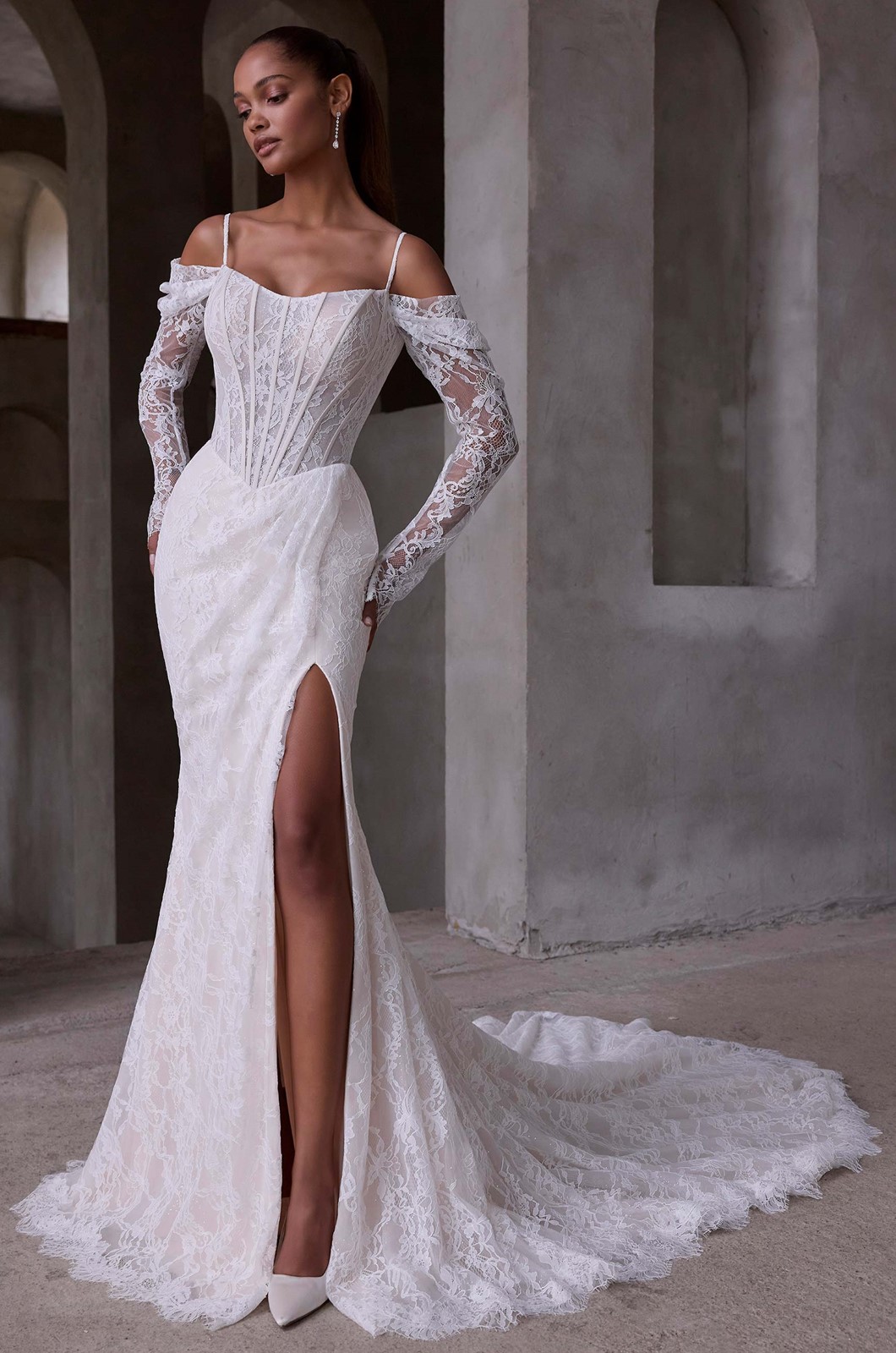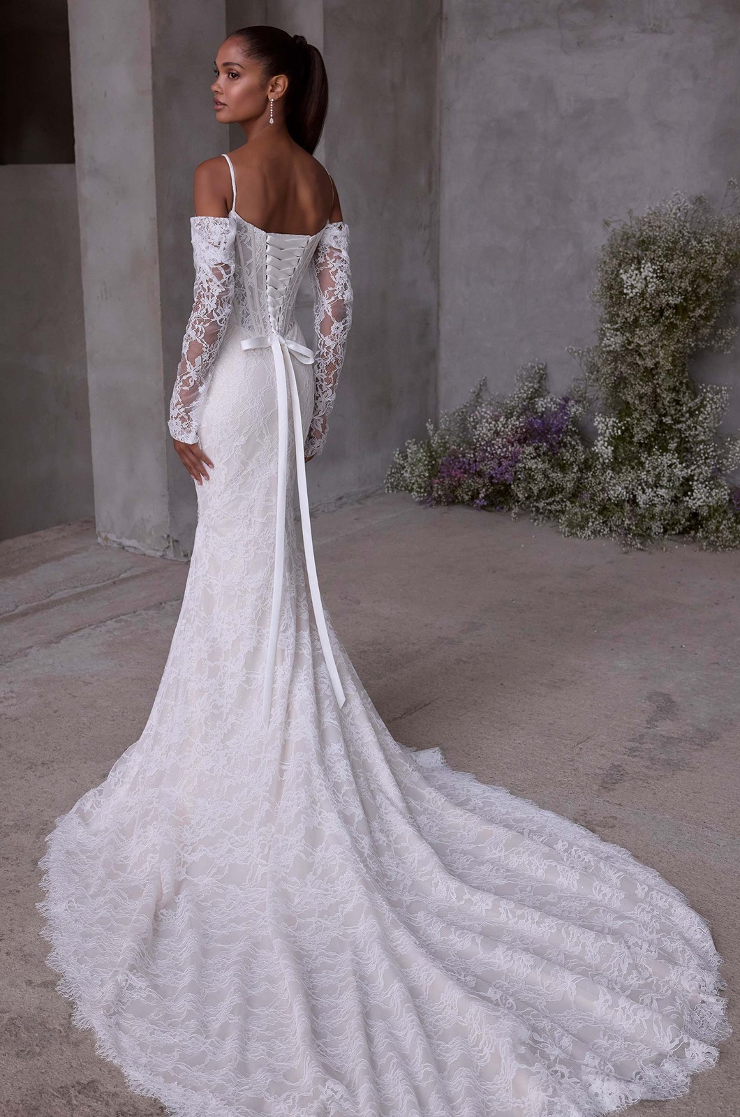 Our Leto wedding dress is contemporary vision of romance. The scoop neck fit to flare gown stuns with delicate thin straps and a structured corset bodice with a lace-up back for a custom fit. Designed in lace over shimmering glitter tulle, it features a thigh-high slit and sweeping train for dramatic movement. Detachable draped lace sleeves offer a soft, ethereal finish to this modern bridal look.