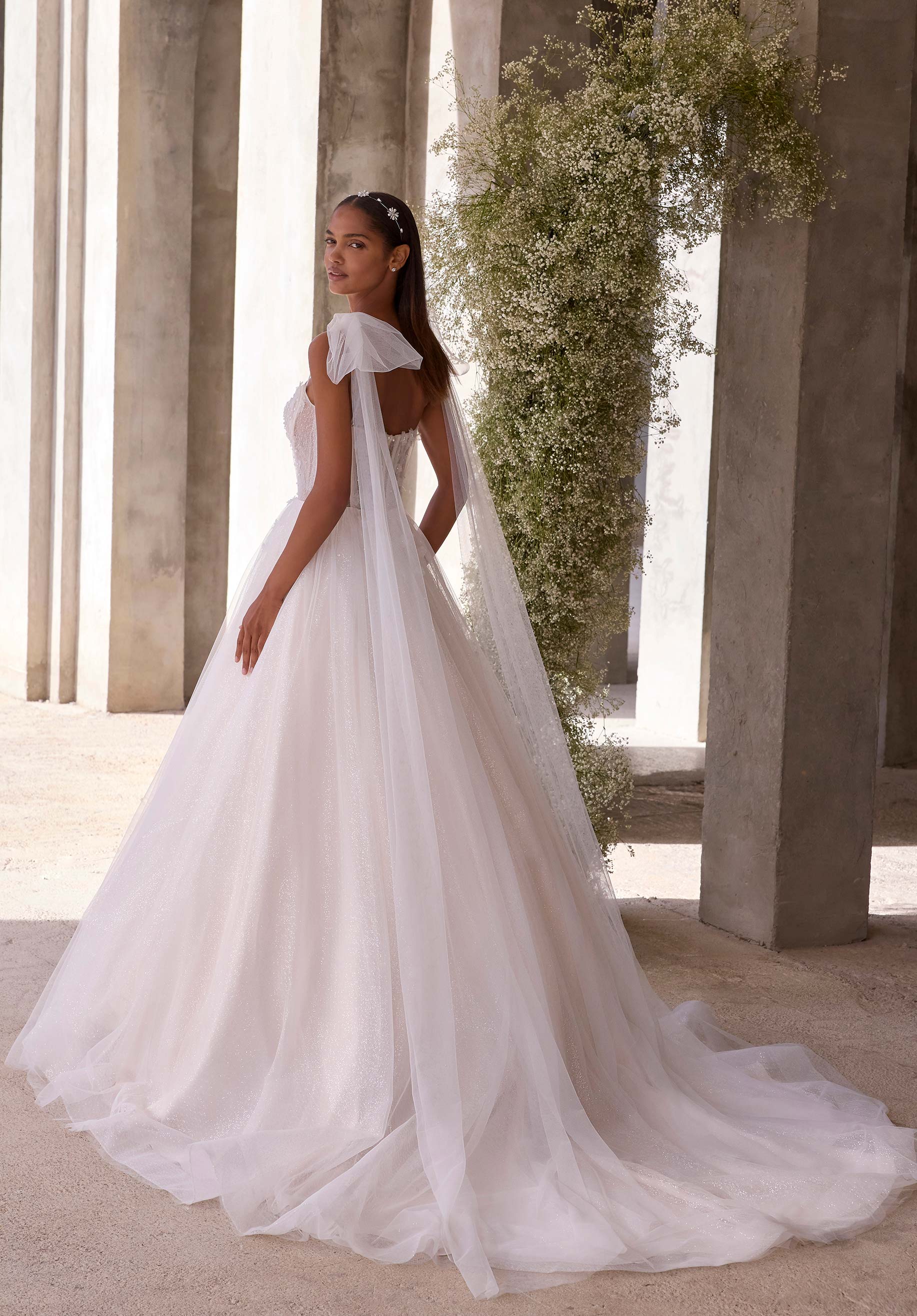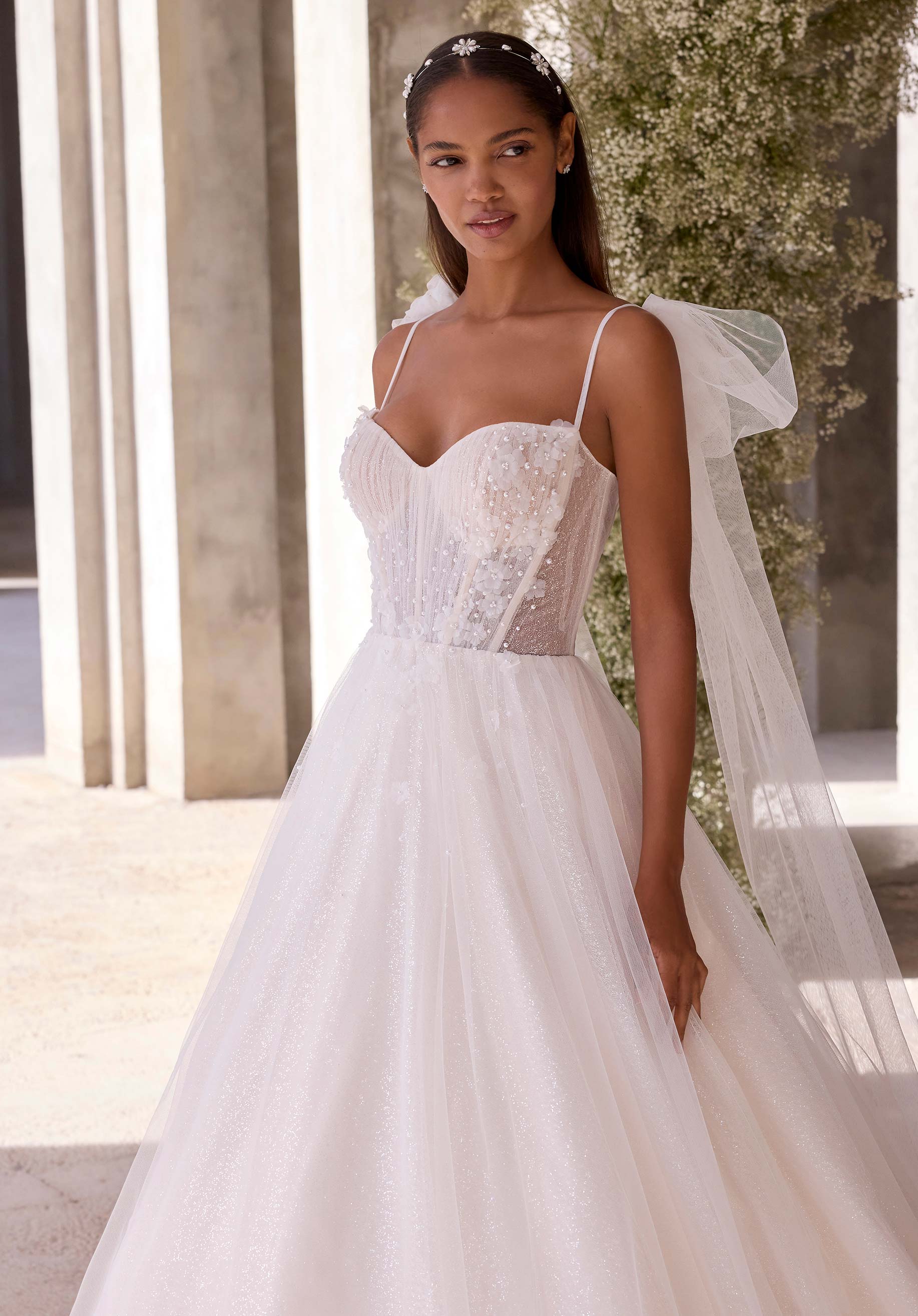 Ethereal and effortlessly feminine, our Loraline wedding dress is an A-line gown featuring a sweetheart neckline and floor-length organza tie bow straps that frame the shoulders with soft drama. A pleated bodice with exposed boning sculpts the silhouette, while floral appliqué dances across layers of glitter tulle for a romantic shimmer. Finished with a sweeping train, it's a modern fairytale come to life.