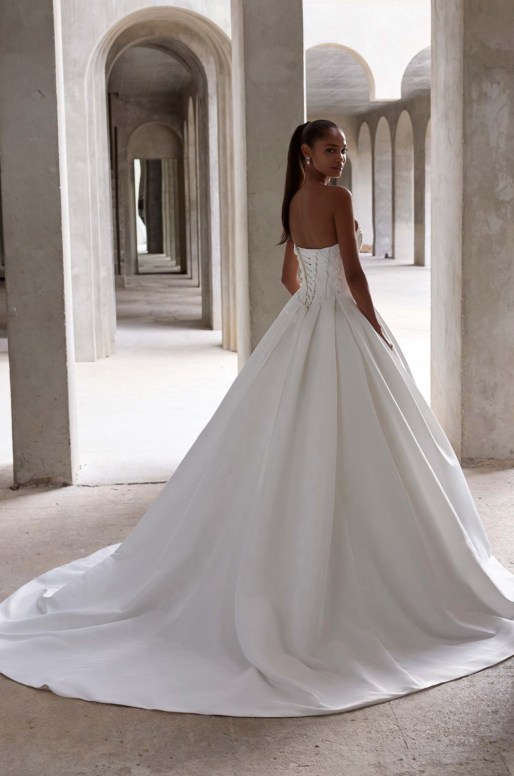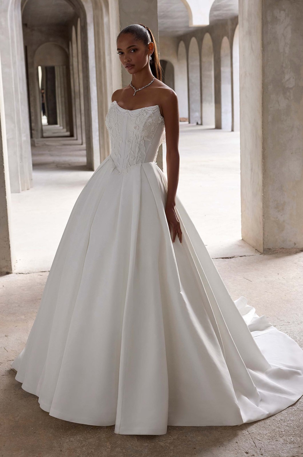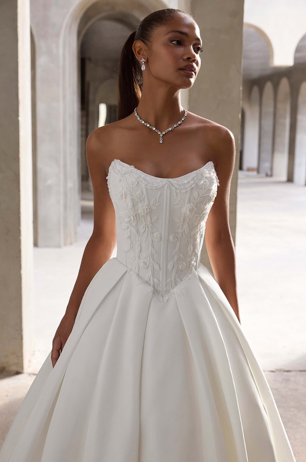Our Lyra wedding dress serves regal beauty, featuring a scoop neckline accented by pearl draping and 3D floral appliqués, while a corseted bodice and basque waist sculpt the frame. The lightweight faille ball gown skirt features crisp box pleats and a sweeping train for a gown that's structured, romantic, and strikingly modern.