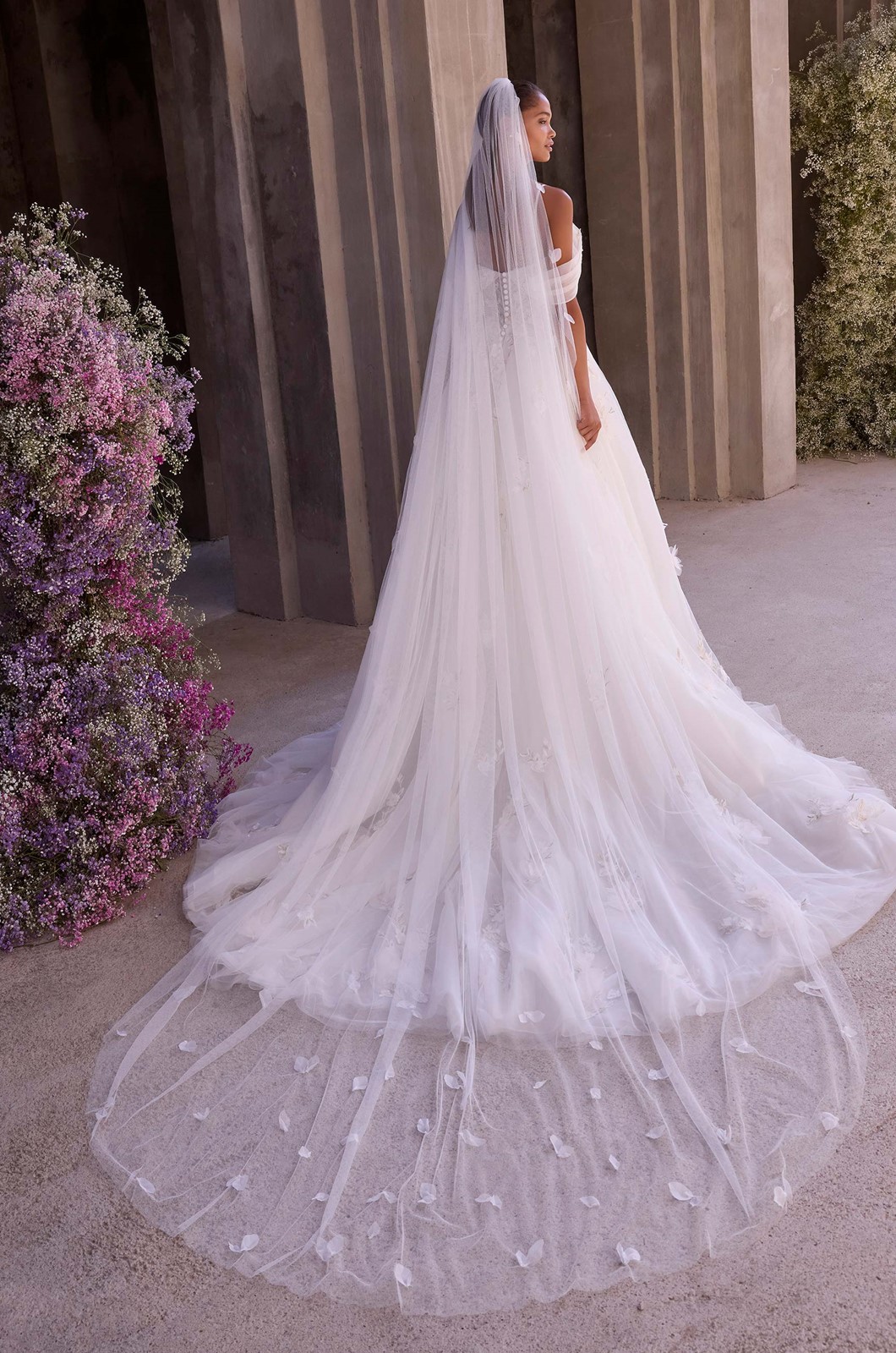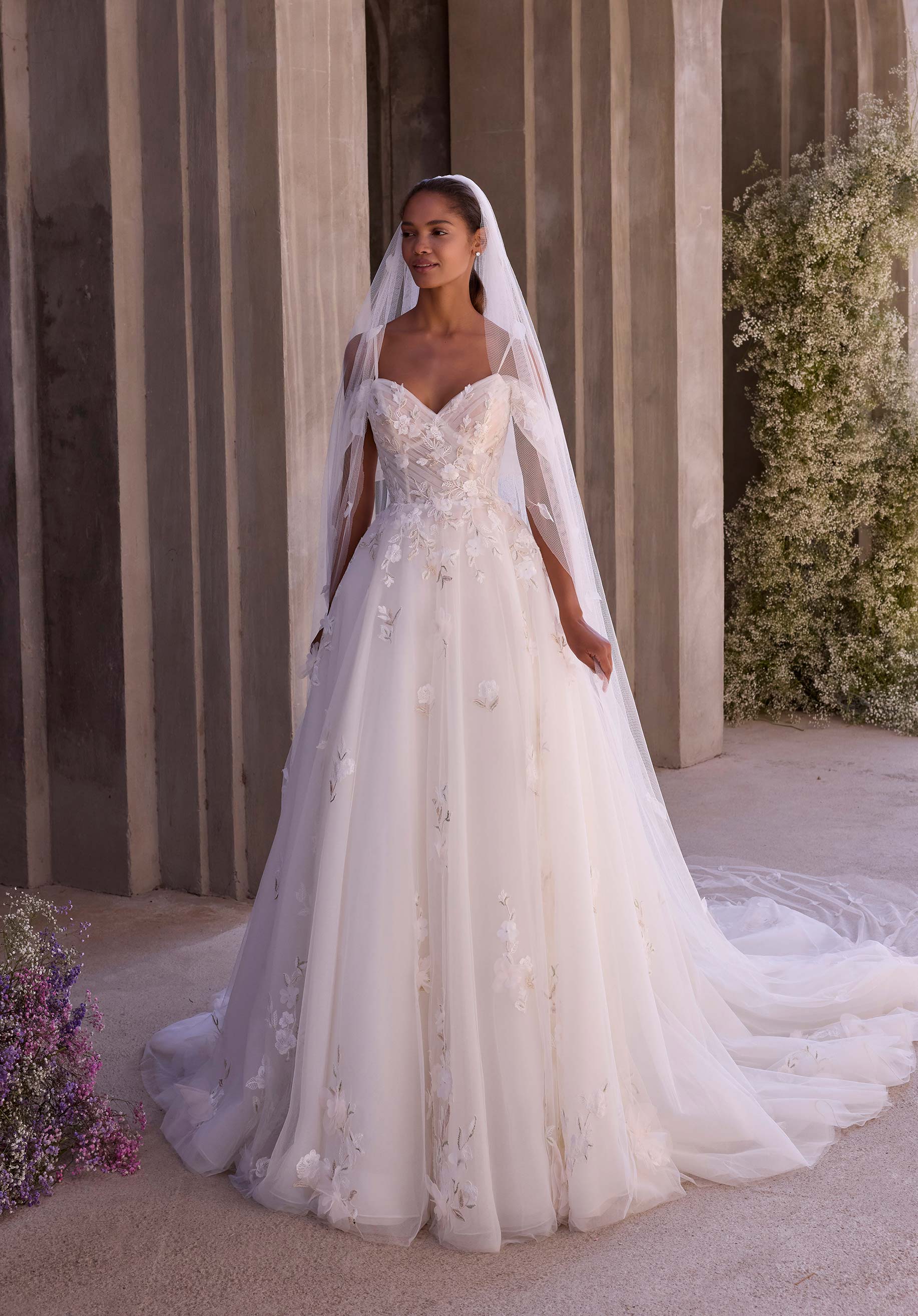 Our Morrigan wedding dress is ethereal and whimsical featuring a draped sweetheart neckline with slender straps paired with a detachable off-the-shoulder drape for soft structure. Crafted in floral threadwork embroidered tulle, the A-line silhouette floats into a sweeping train, finished with a detachable tie-ribbon bow for a gown that feels delicately bold.