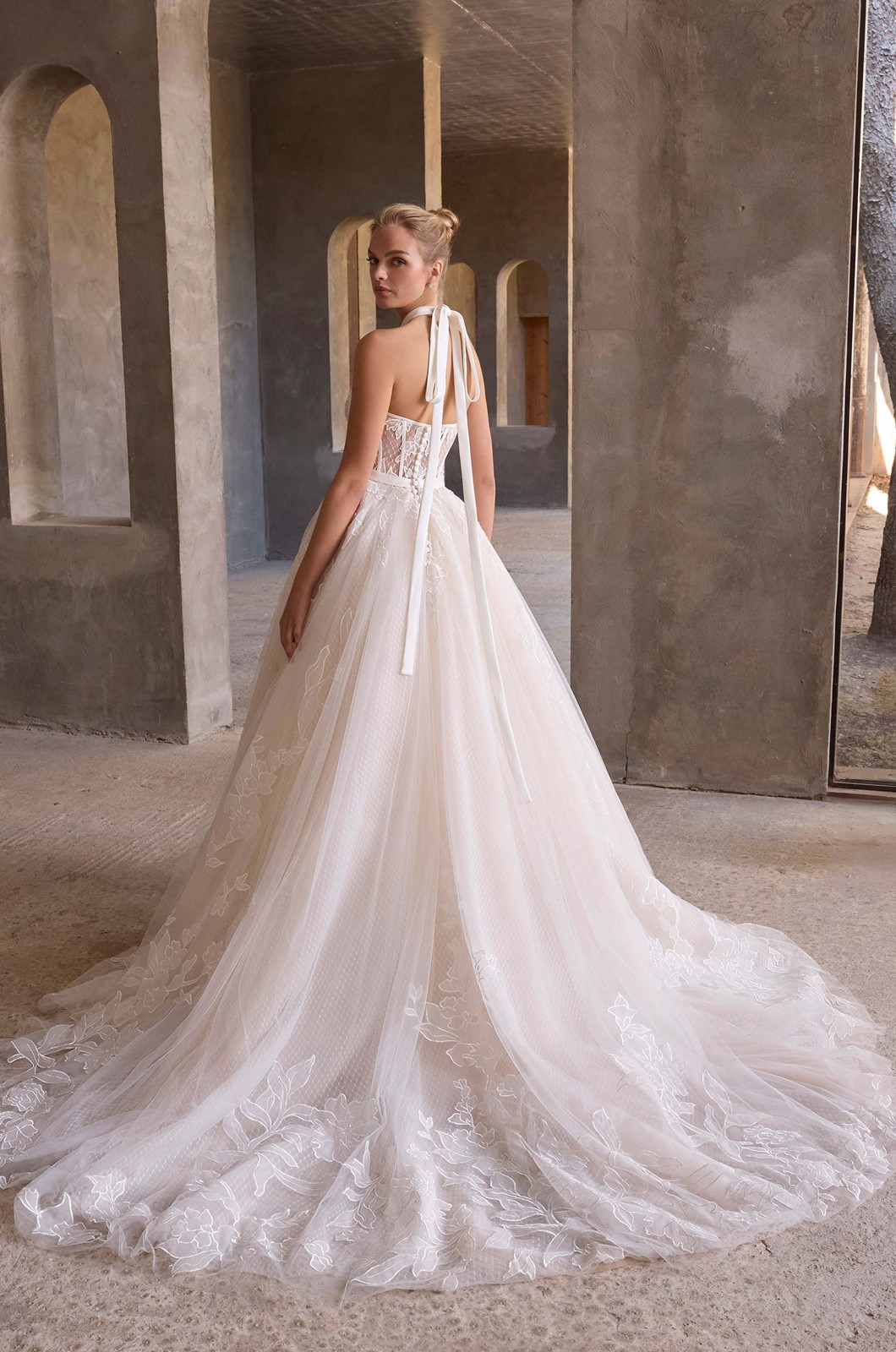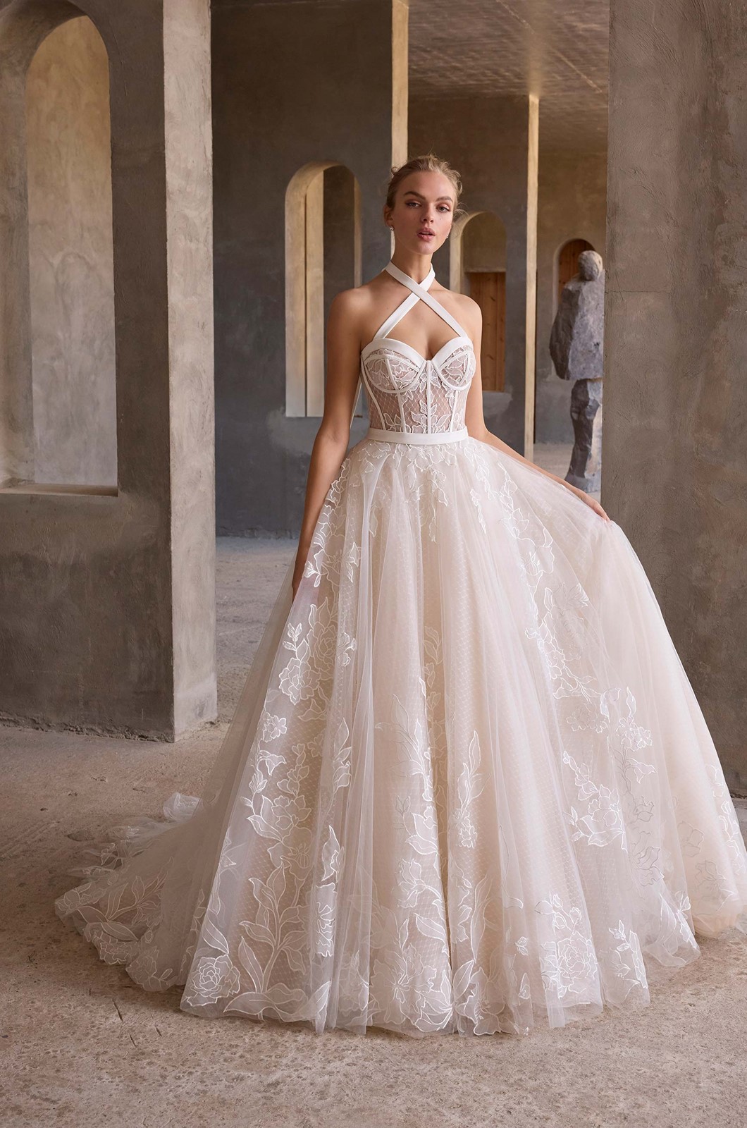 Playful romance with a polished twist, our Myra wedding dress features a strapless sweetheart neckline with a detachable satin criss cross halter strap that ties into a statement bow for sculptural contrast. The sheer, boned bodice shows off the delicate swiss dot fabric, flowing into the A-line skirt, adorned with airy organza floral appliqués.