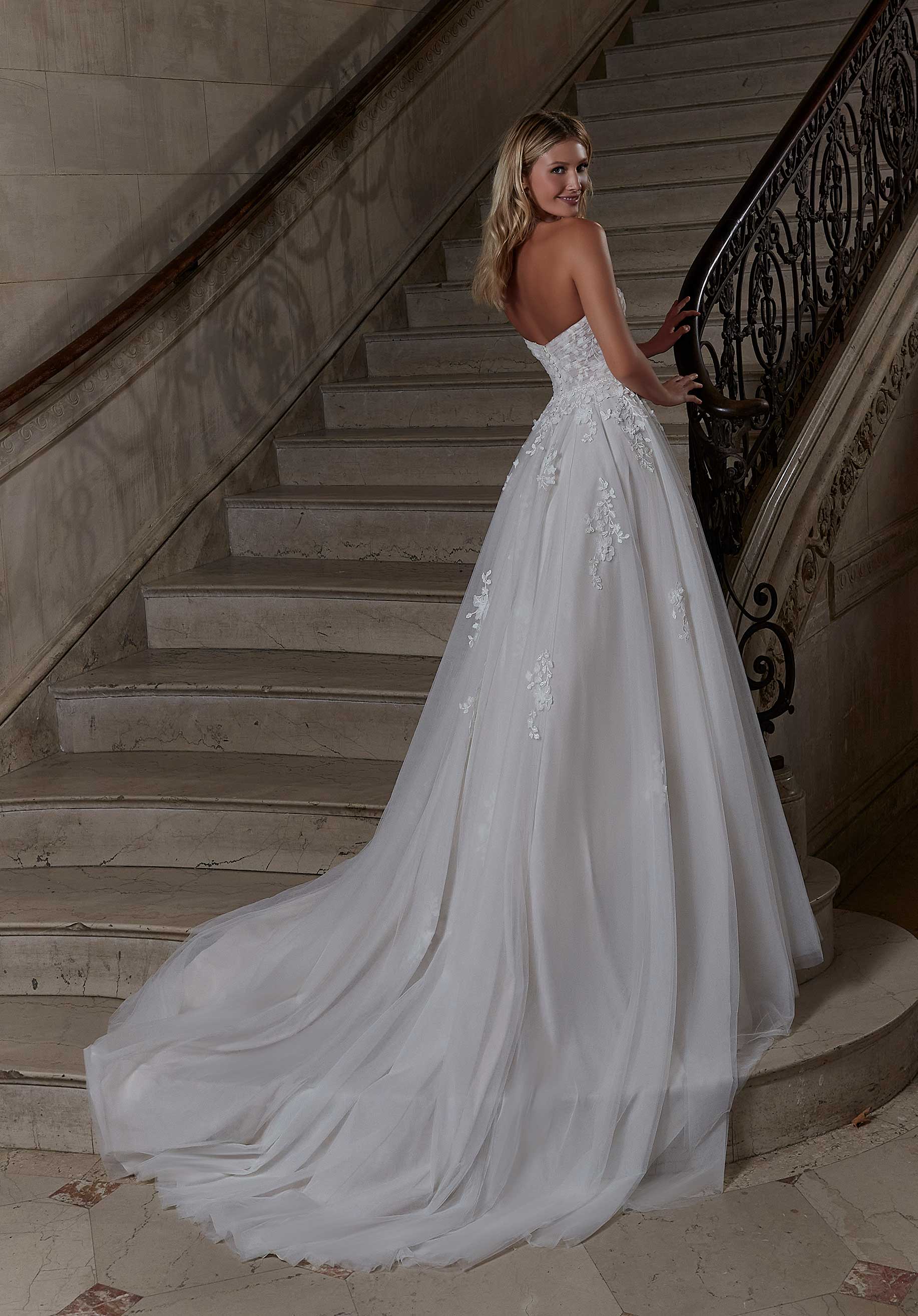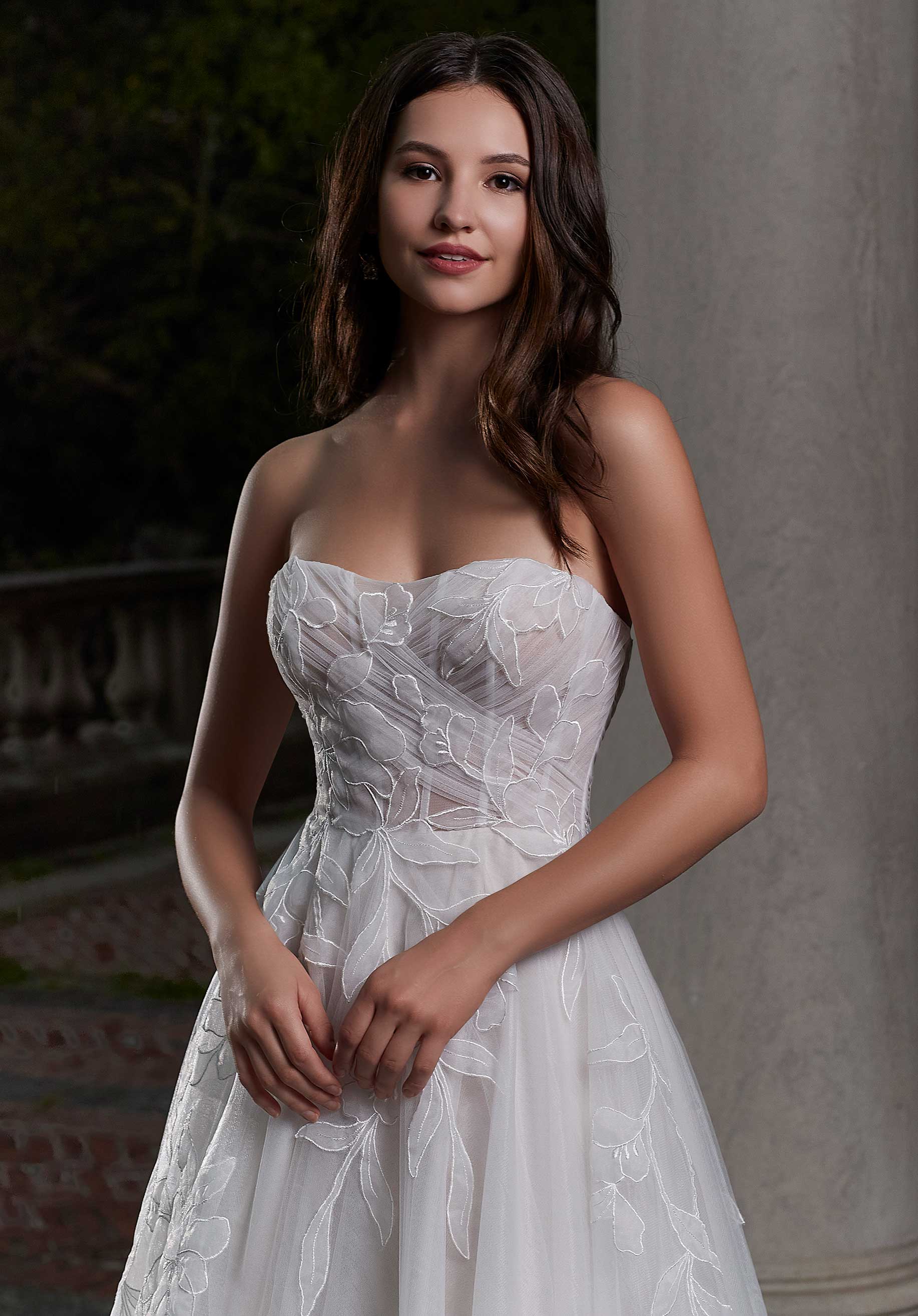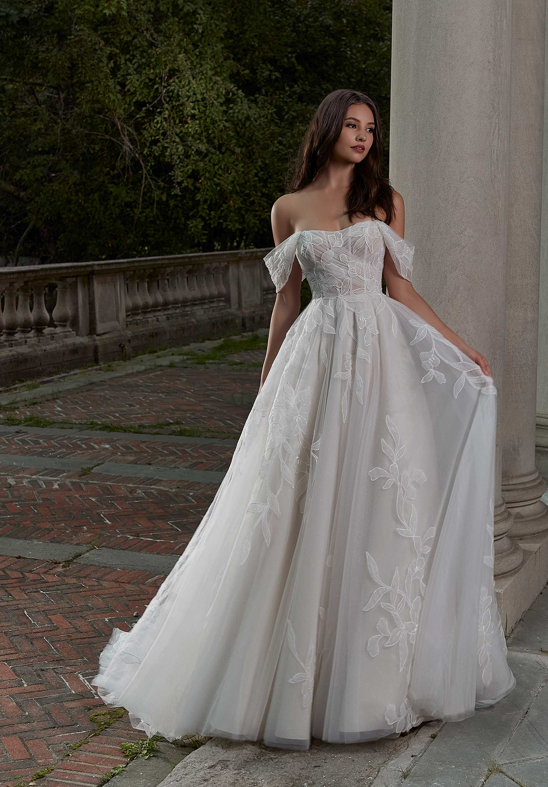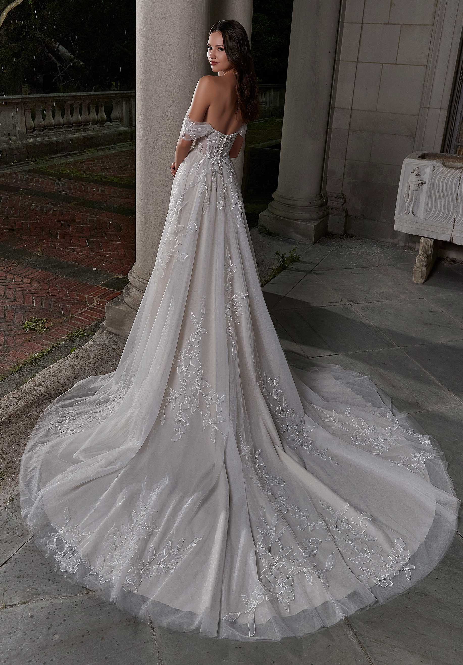 Dreamy draping takes center stage on our Pacifica designer wedding dress. The floating tulle ball gown has a sheer corset bodice featuring asymmetrical draping with detachable off-the-shoulder sleeves. Floral organza embroidery has an ethereal effect offering delicate texture to the effortless dress. Shown in Ivory/Light Champagne/Honey.