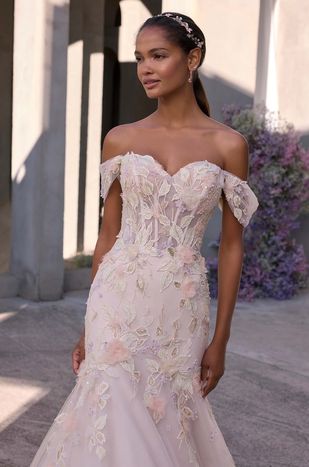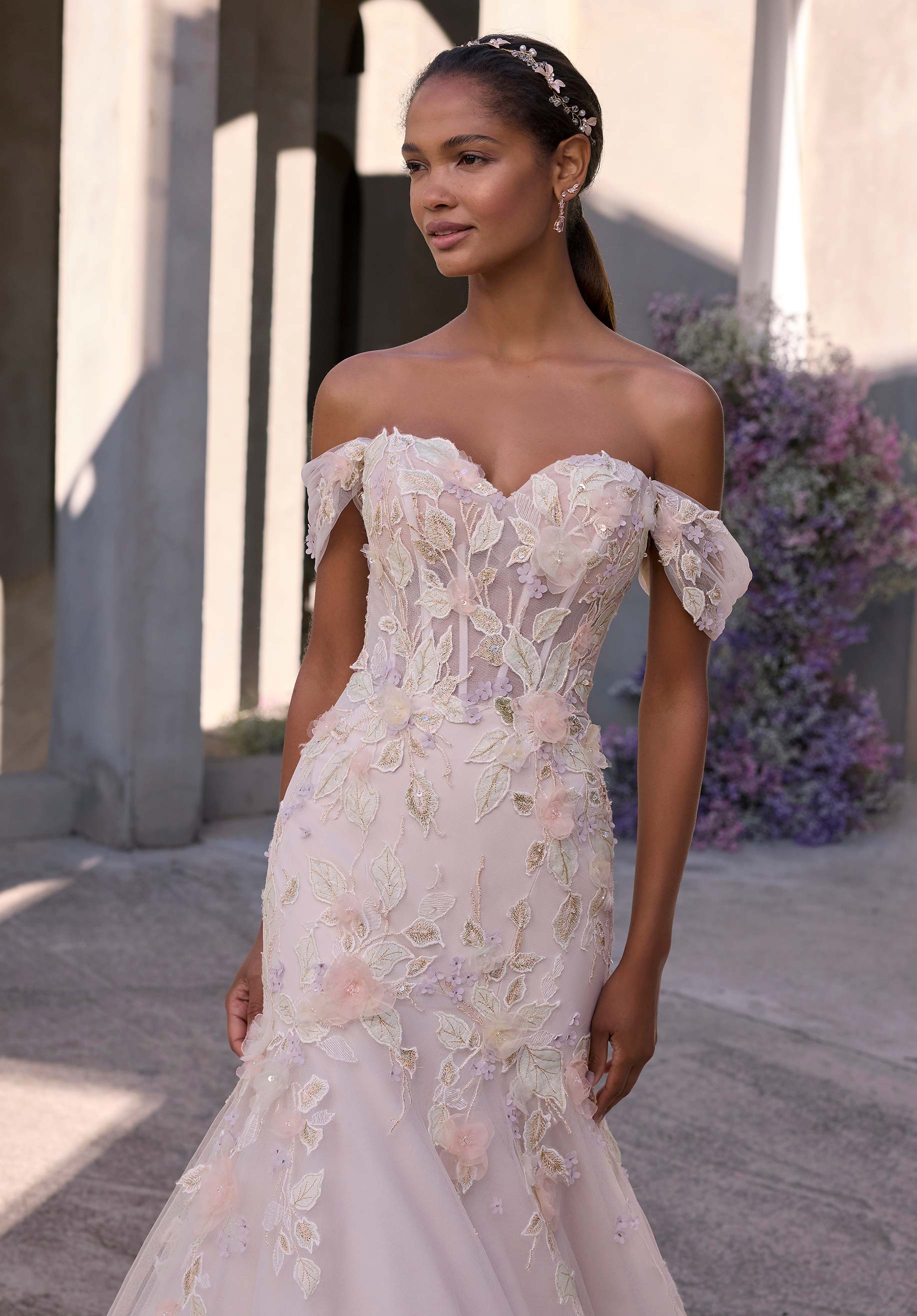 Soft structure meets floral fantasy in our Rey wedding dress. The strapless sweetheart neckline is framed by detachable off-the-shoulder sleeves adorned with delicate threadwork and organza petals. The tulle fit and flare silhouette has a sheer bodice with corset boning sculpts the body and flows into a romantic train.