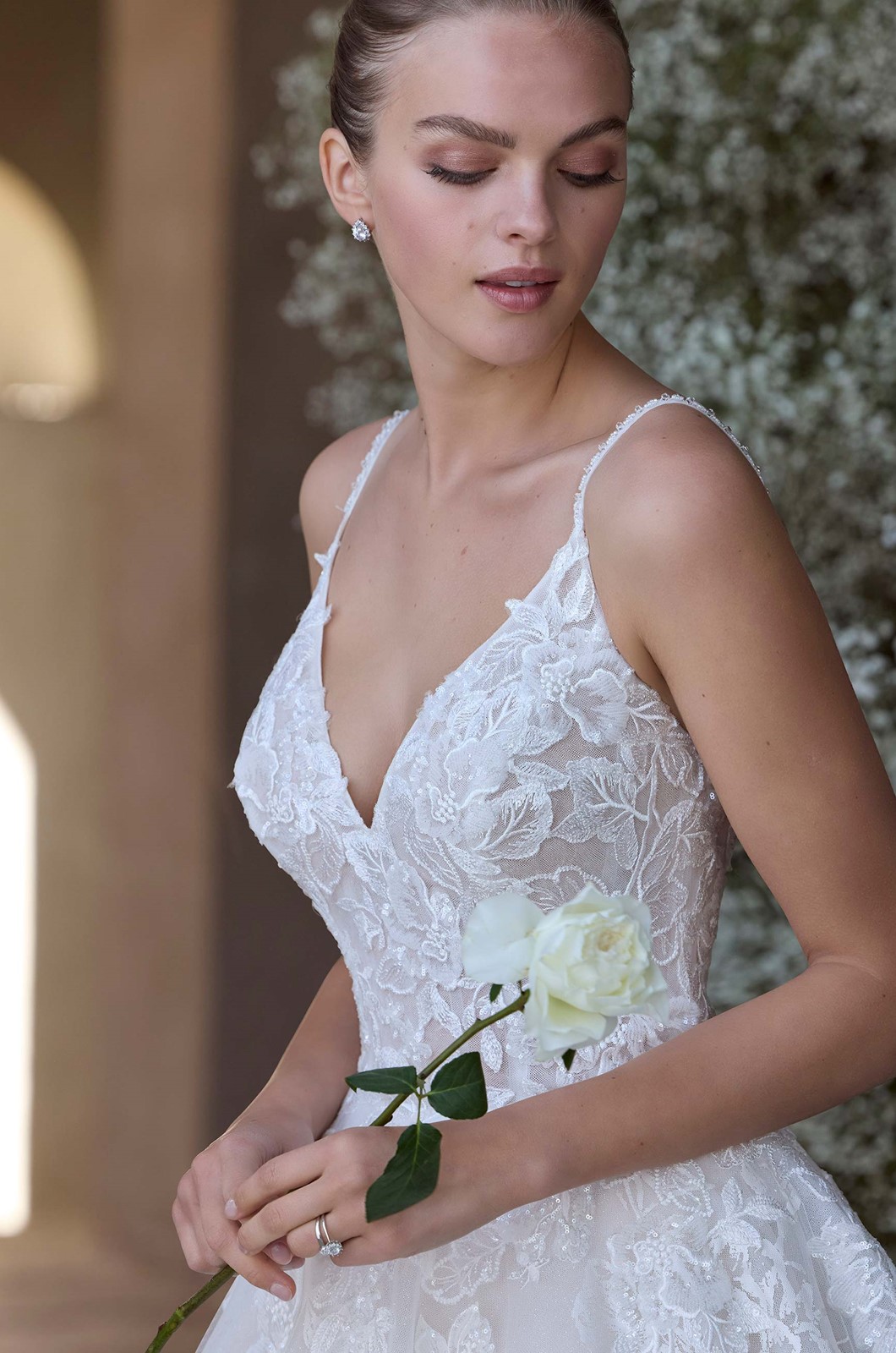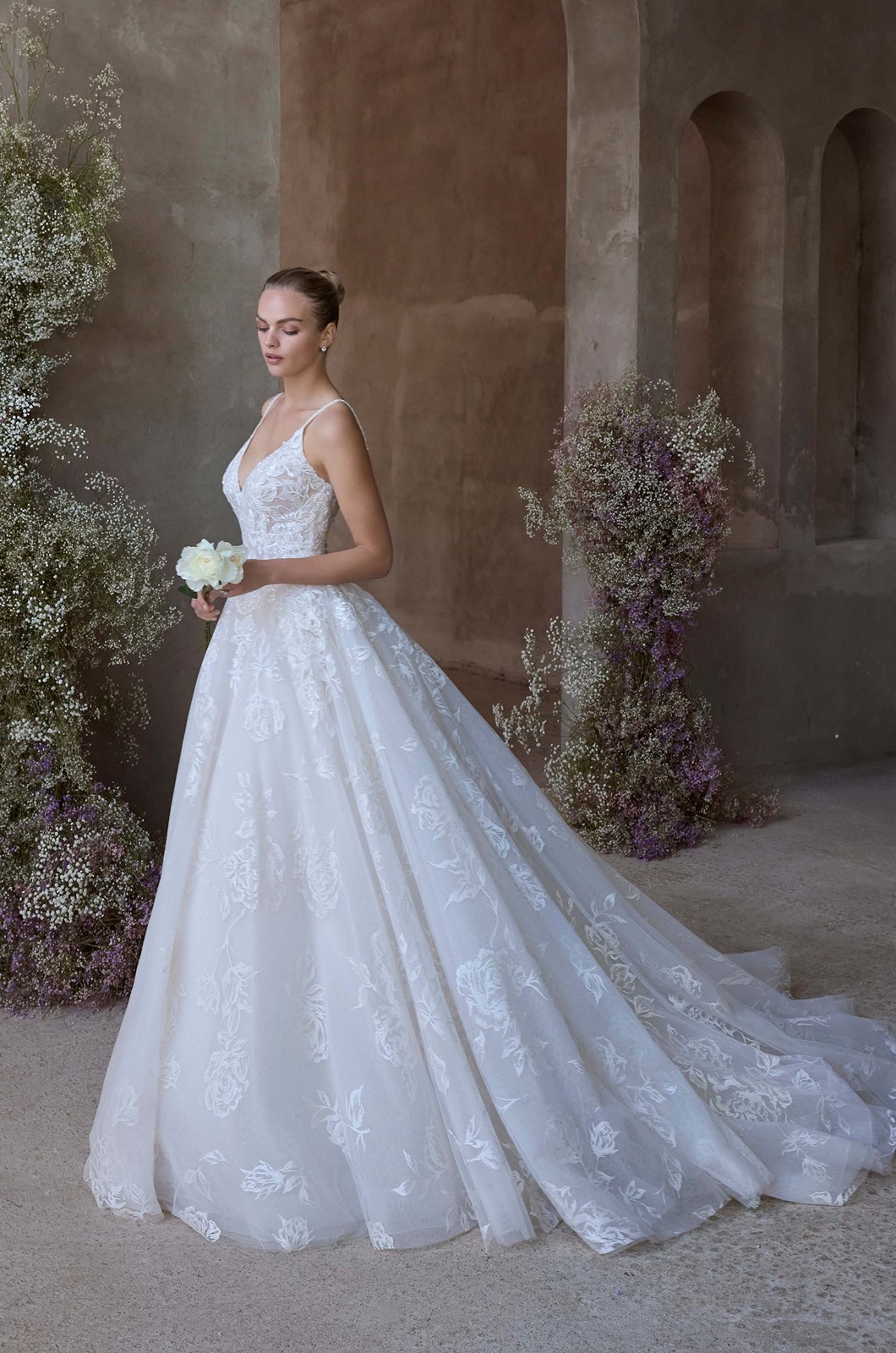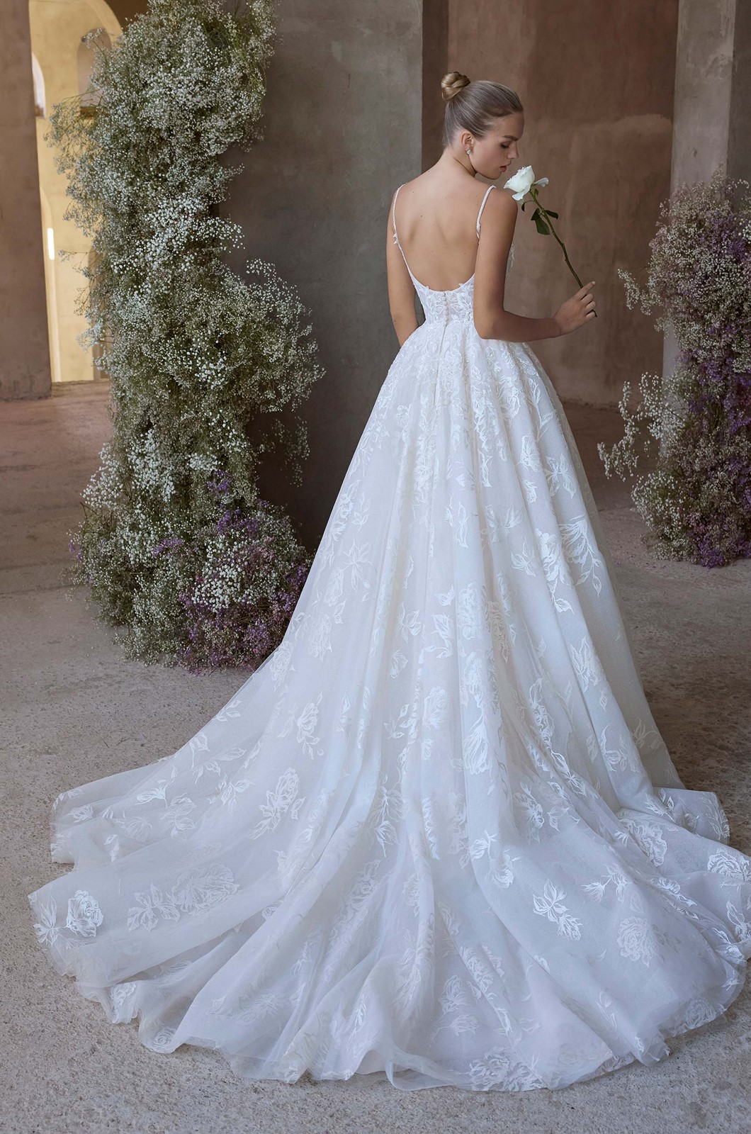 Our Rosie wedding dress delivers a fresh, editorial silhouette for the bride with an eye for artistry. The v-neck ball gown stuns in rose-printed organza layered over subtle glitter tulle. Thin straps and structured boning sculpt the bodice, while the voluminous skirt and train add a sense of dreamy grandeur.