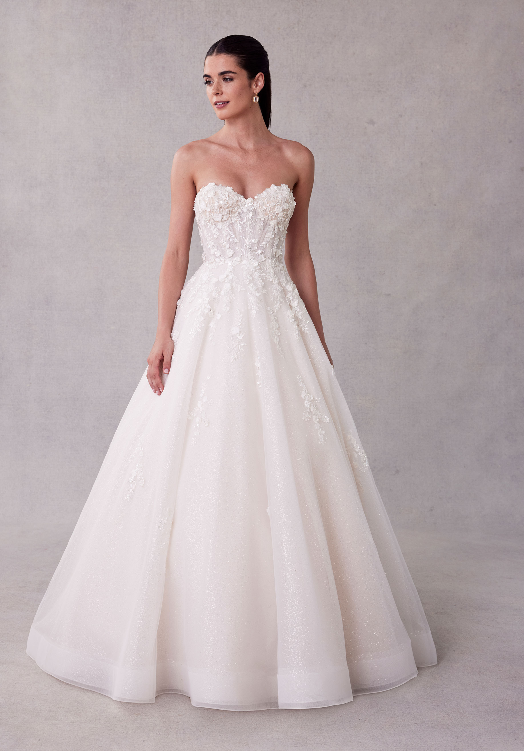 Stunning ball gown has a strapless sweetheart neckline on a draped tulle bodice with beaded lace on an A-line glitter net skirt.
