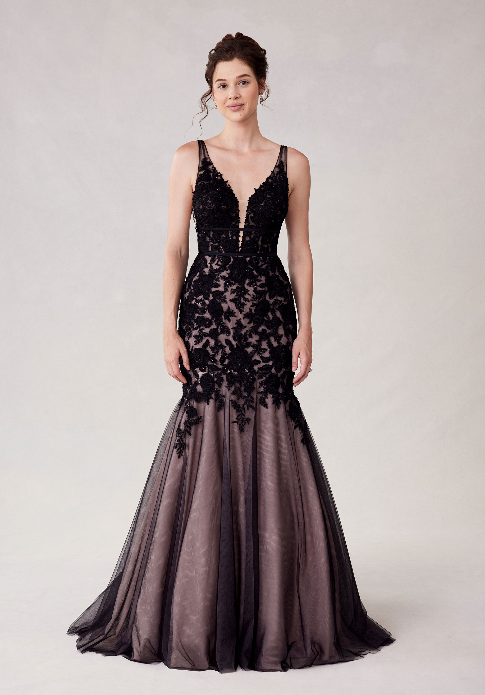 Botanical mermaid wedding dress has a sheer plunging bodice and double banded waist with crystal beaded embroidered lace appliqués and an open v-back.