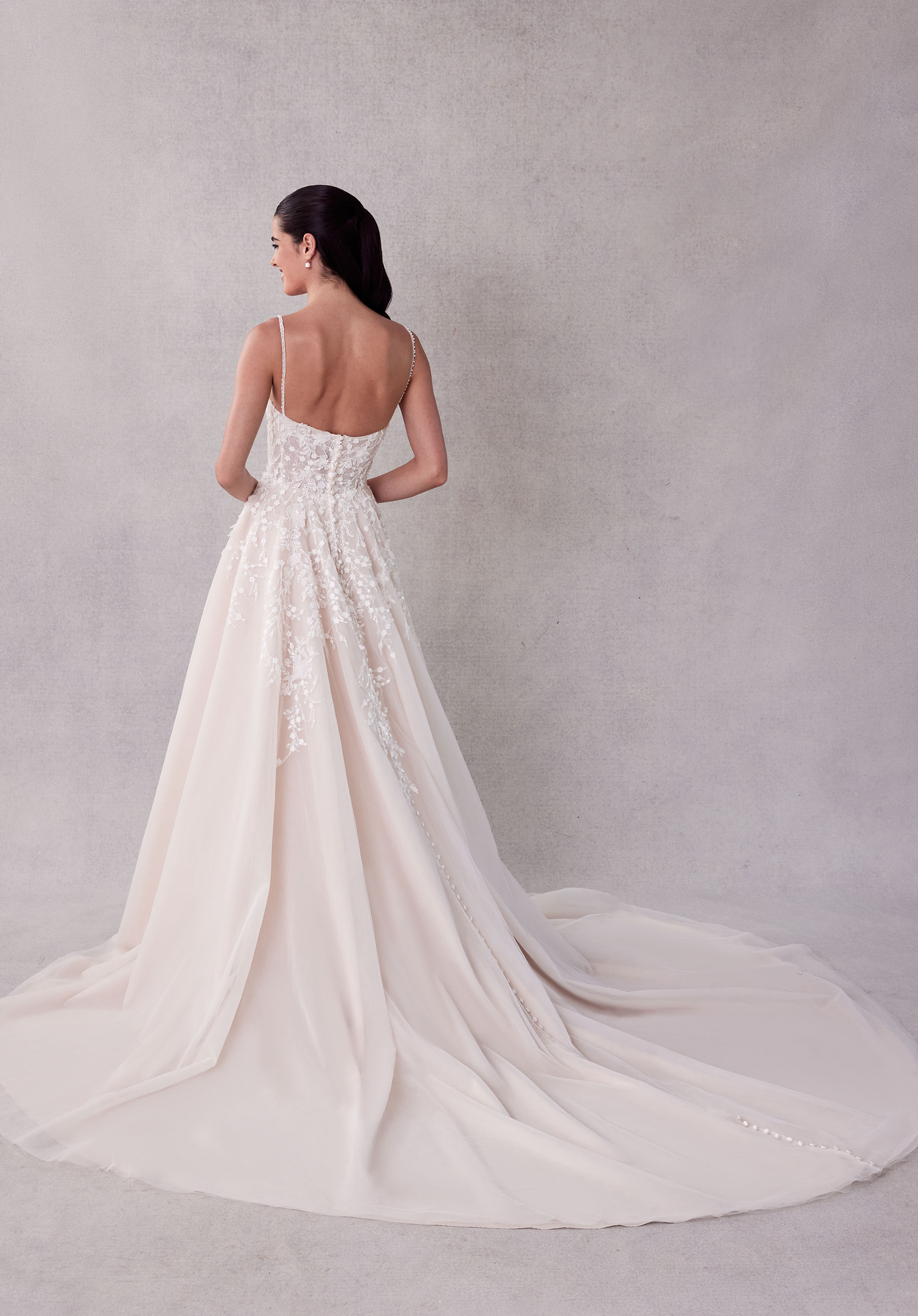 Fairytale wedding dress has a modified sweetheart neckline on boned bodice with beaded, embroidered 3D lace appliqués on tulle over Chantilly lace.