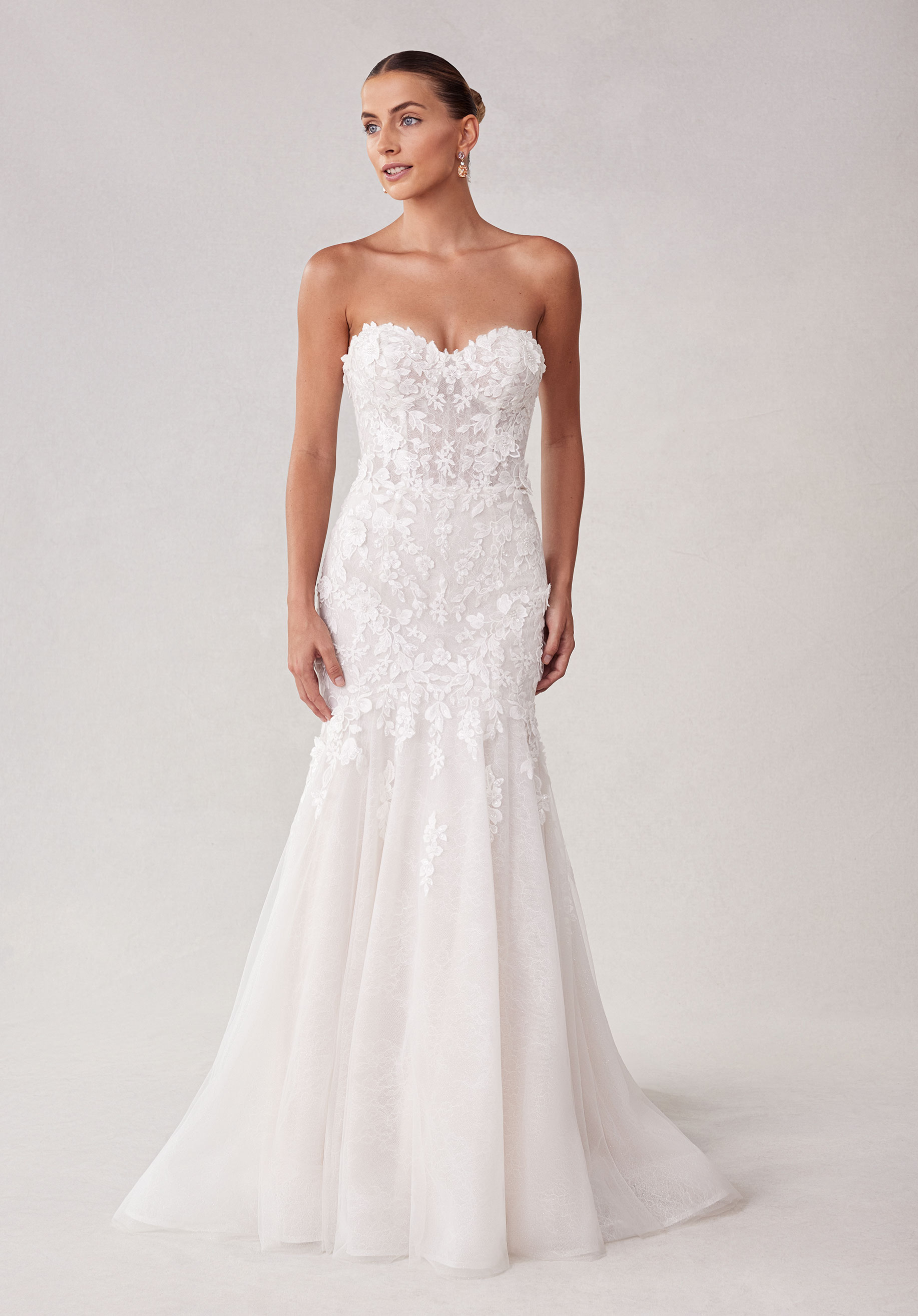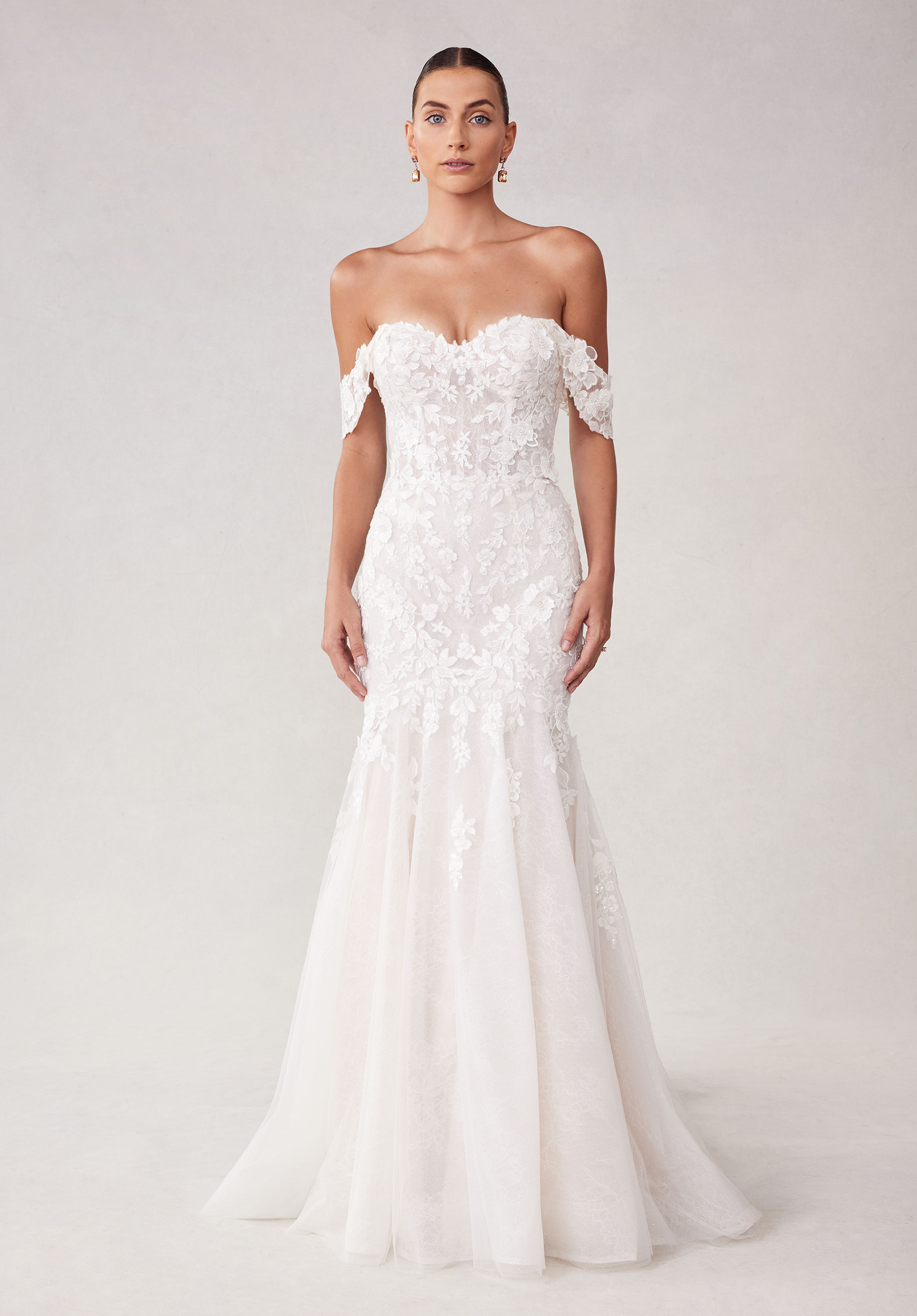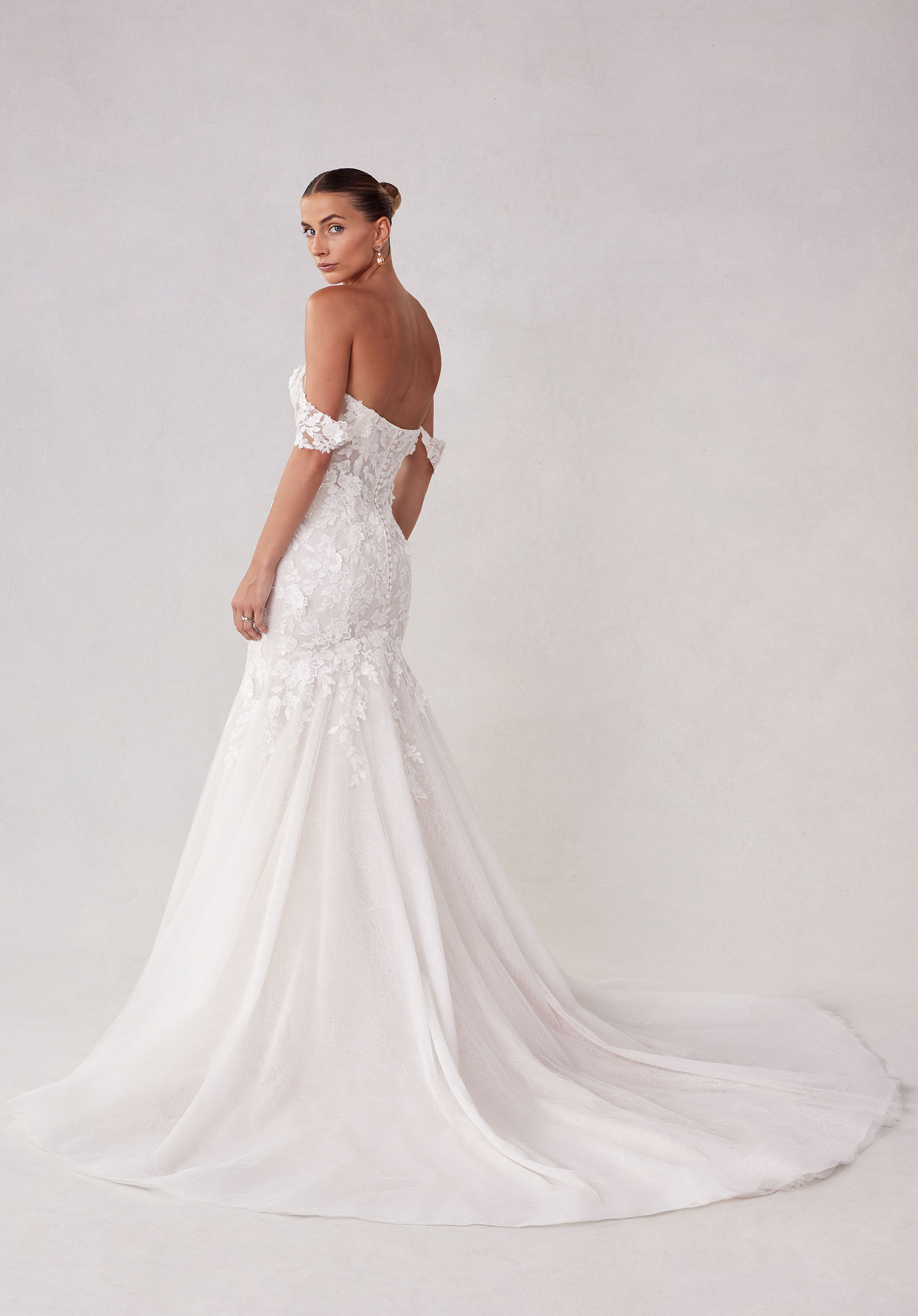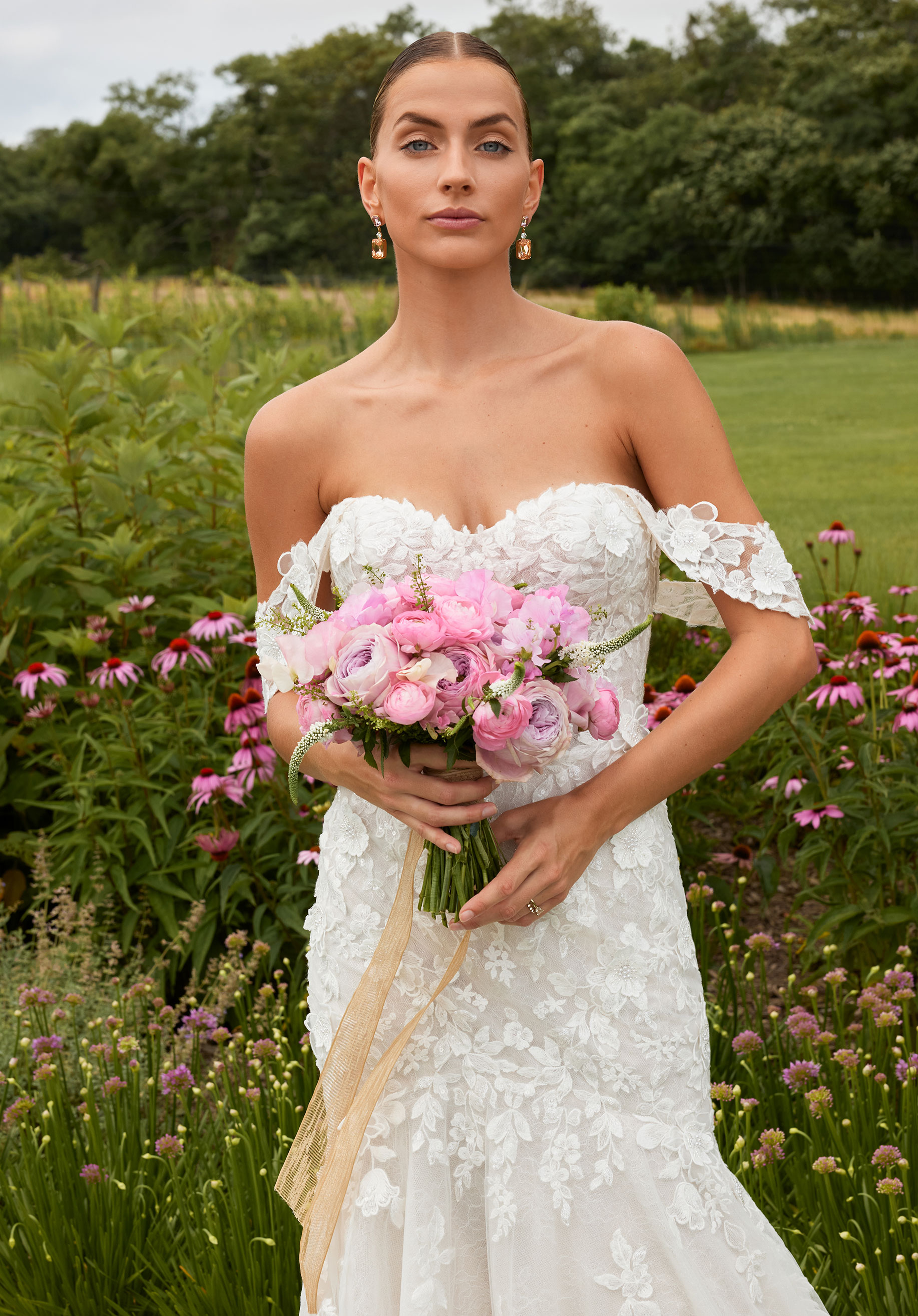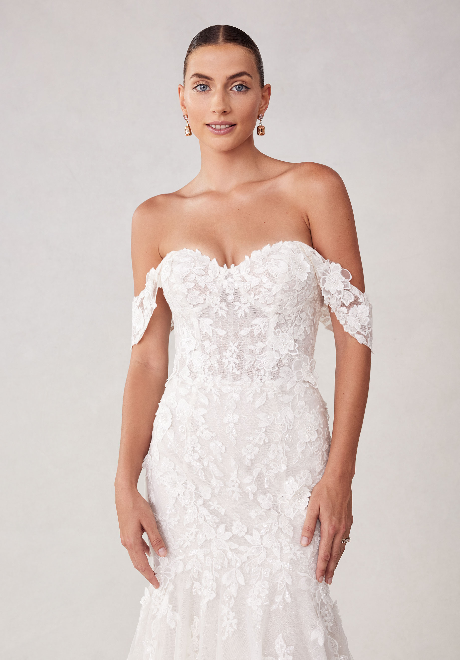 Feminine fit and flare wedding dress has a sweetheart bodice in Chantilly lace with embroidered beaded lace appliqués and detachable off-the-shoulder sleeves.