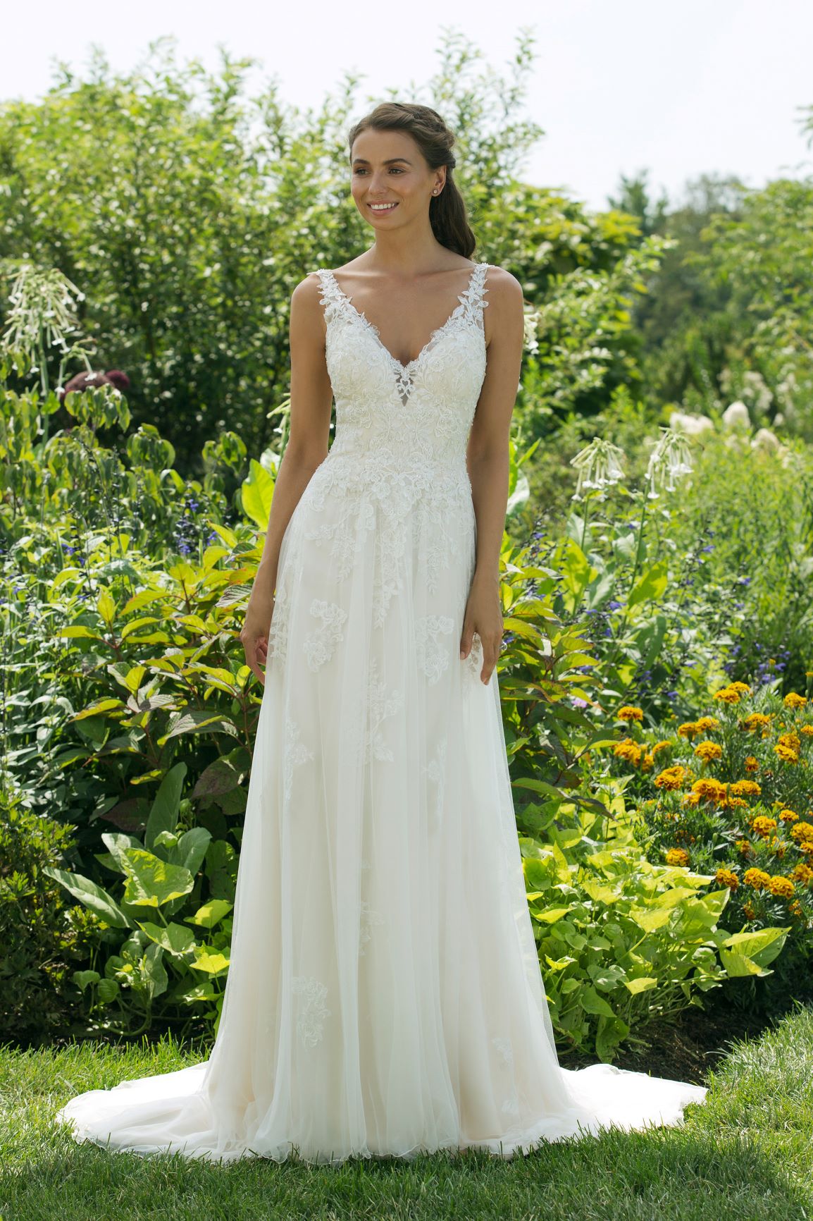 V-neckline with illusion straps and beaded lace appliques continuing through the bodice to create a basque waistline. Lace appliques throughout the skirt with a tulle A-line overlay.