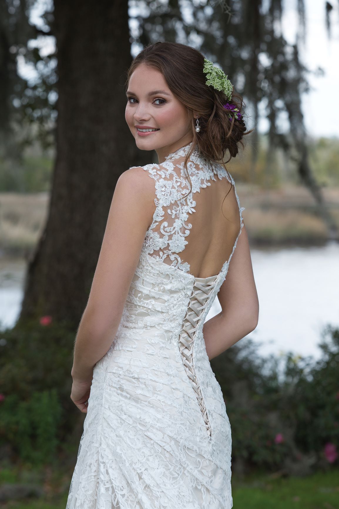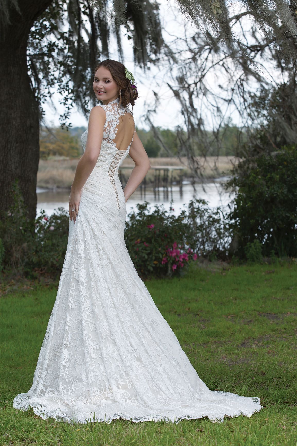 An allover lace slim A-line gown featuring a Queen Anne neckline, ruched natural waistline, lace up keyhole back, and finished hem lace edging the chapel length train.