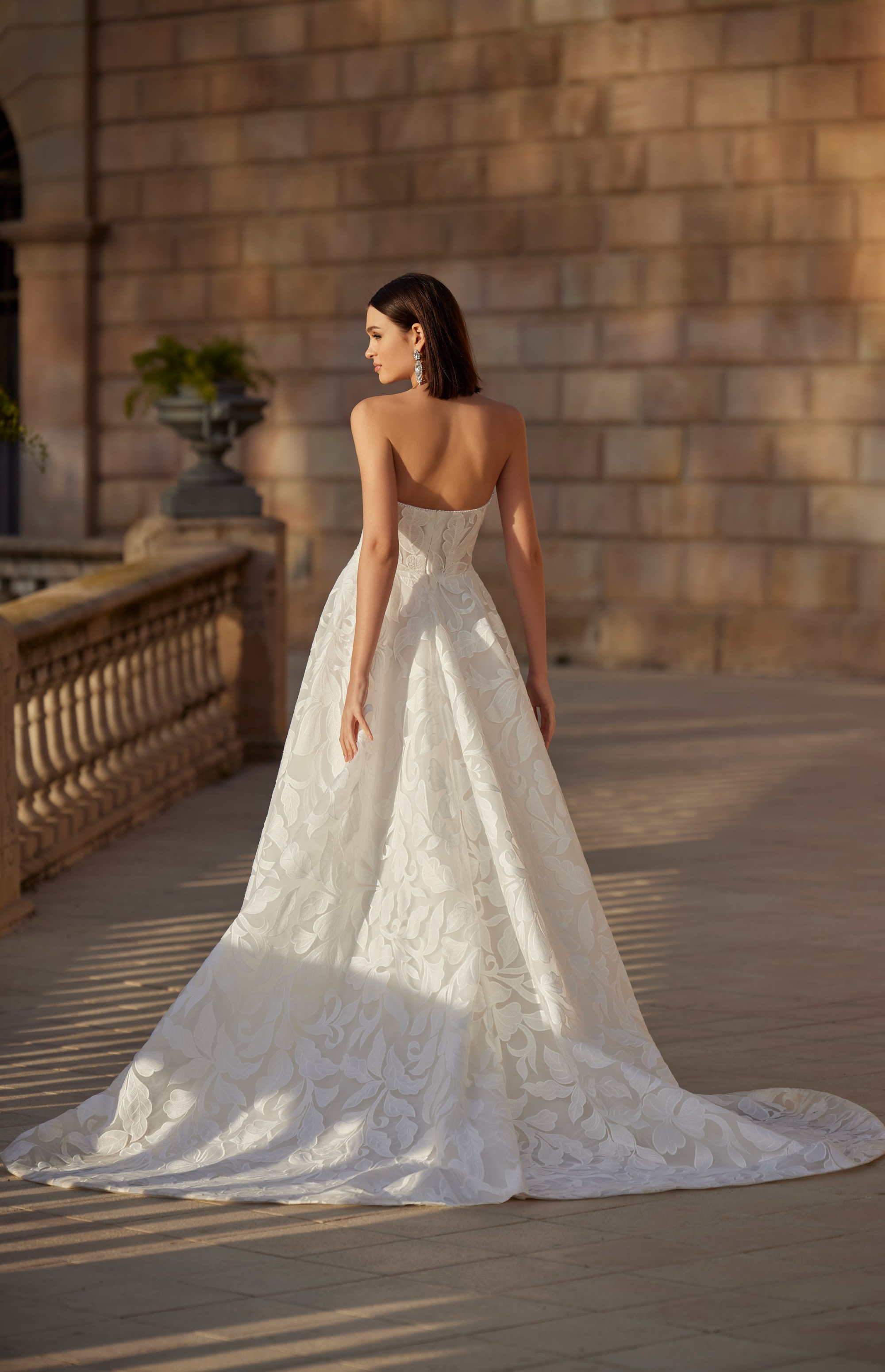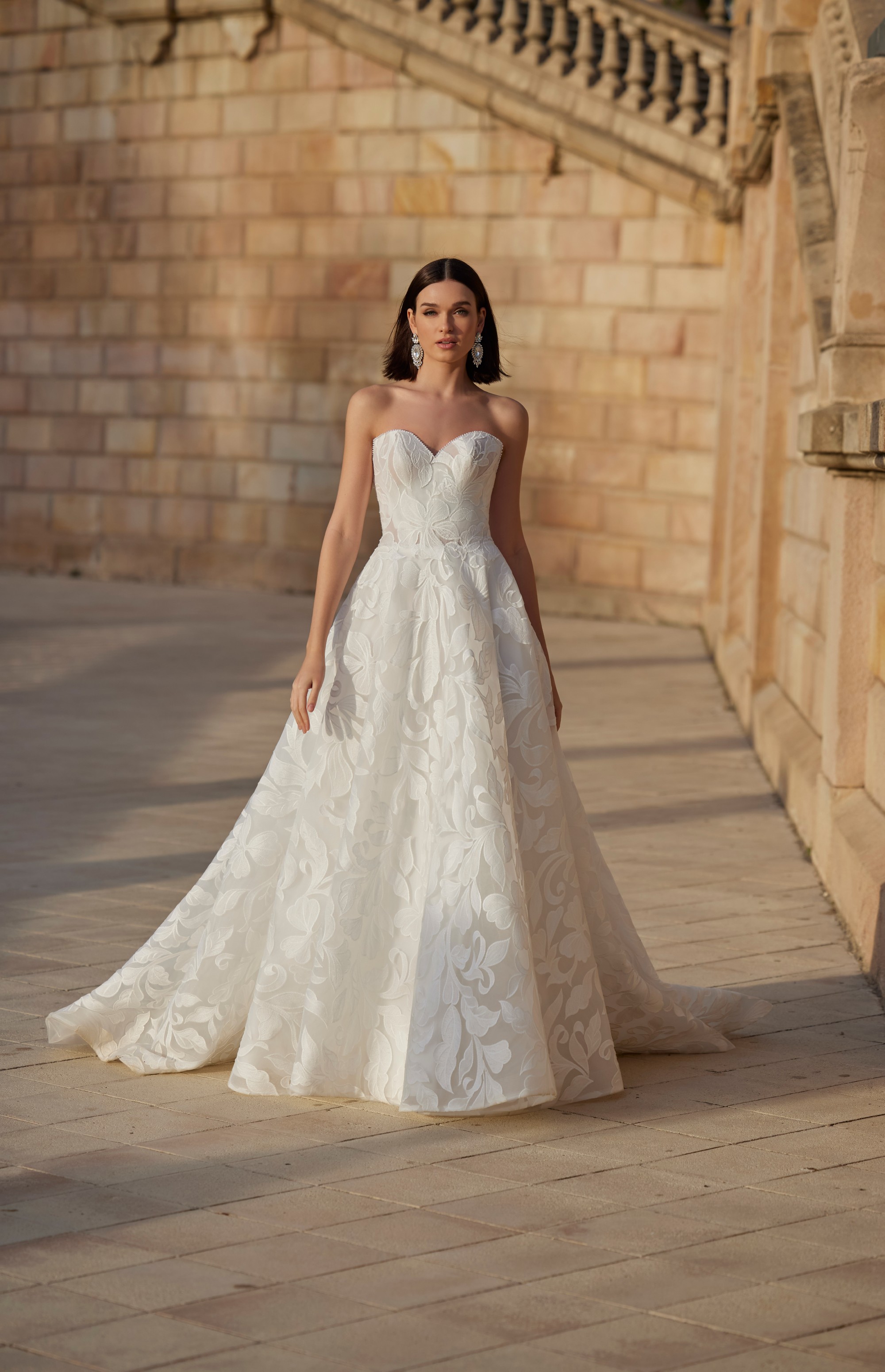 A contemporary ballgown wedding dress that showcases a strapless sweetheart neckline, adorned with botanical organza lace and intricate pearl detailing on the waist and bodice trim.