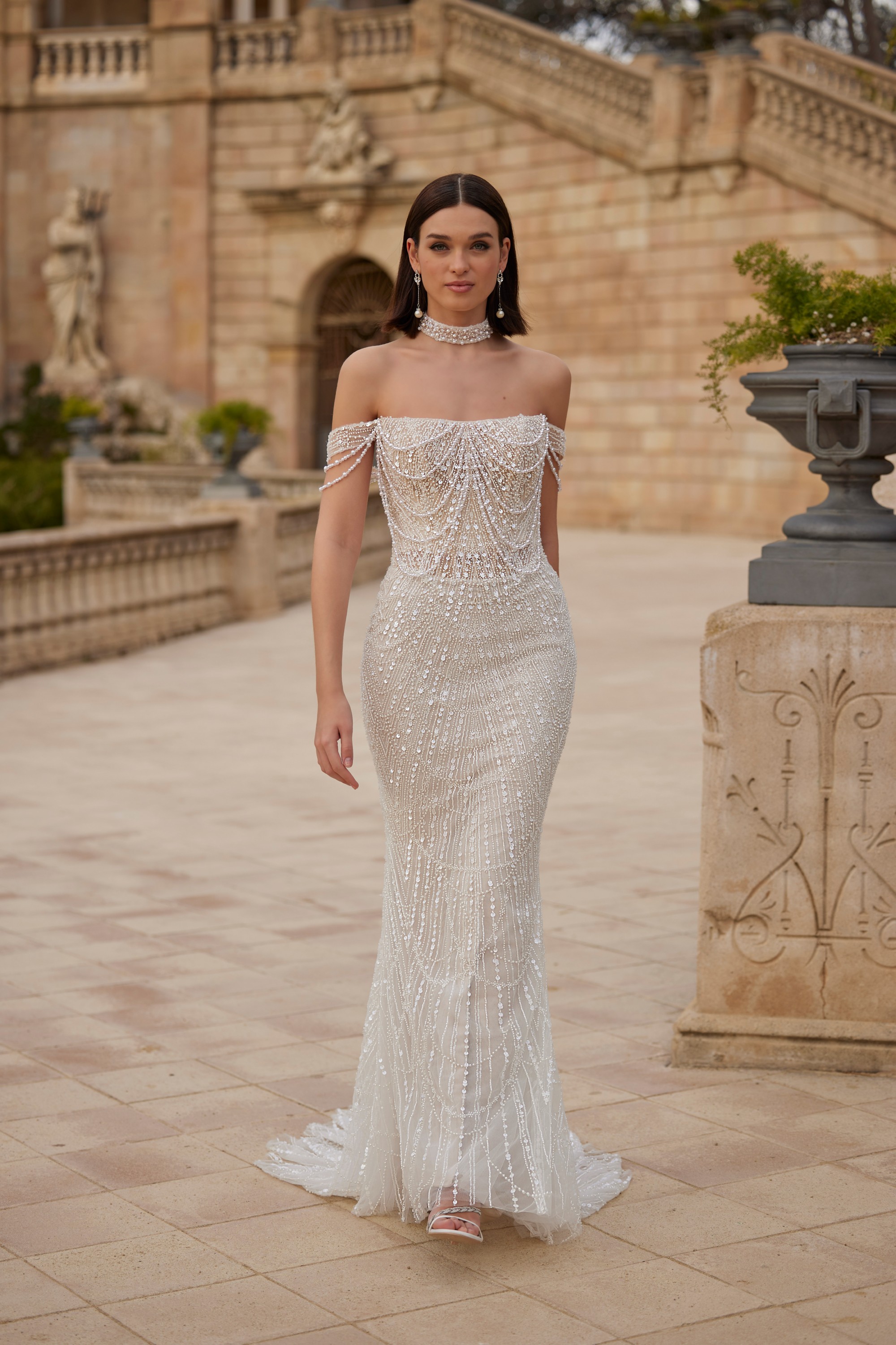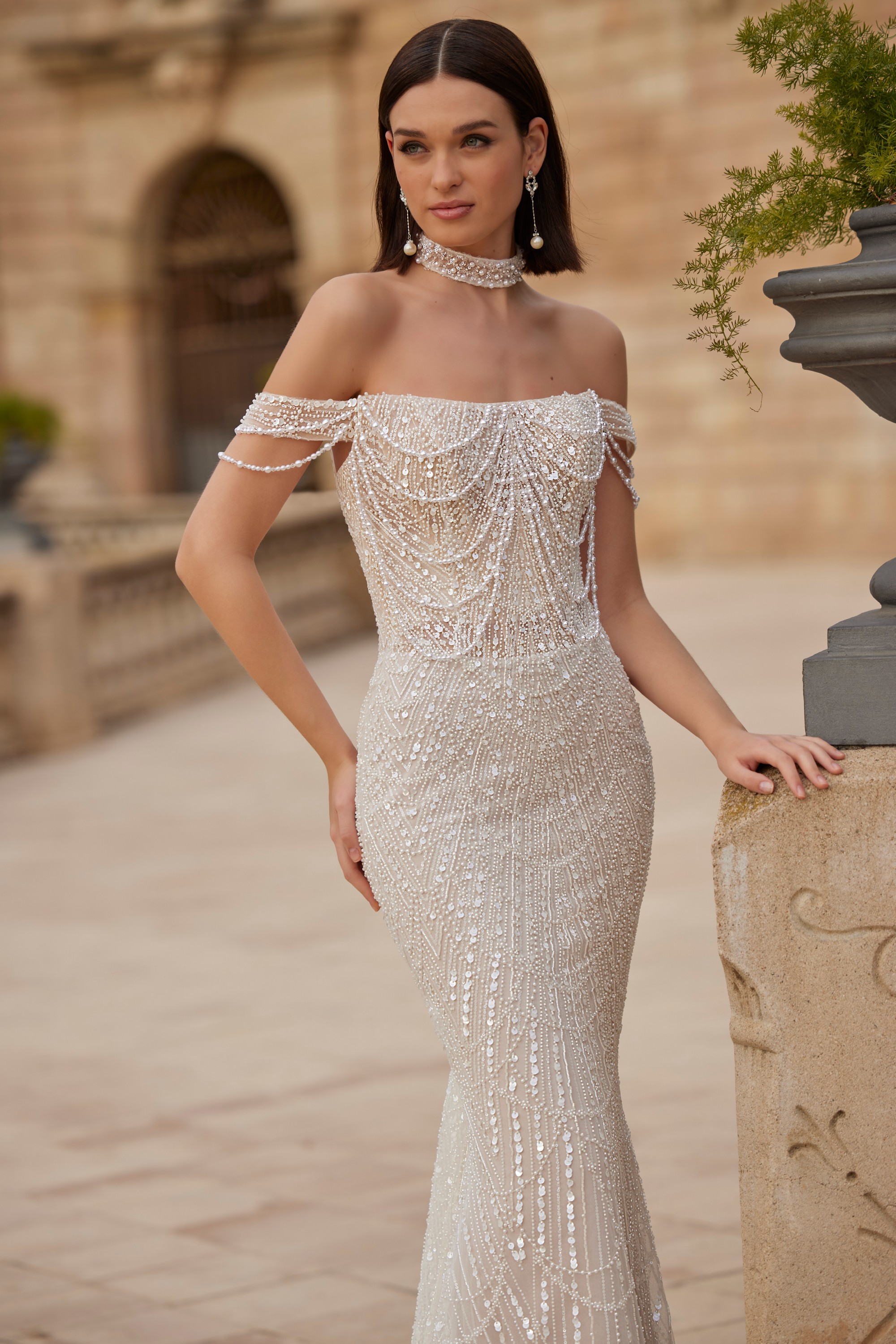 A wedding dress inspired by the 1920s, adorned with pearl beads, showcasing beaded drop cap sleeves and accompanied by a matching pearl choker.